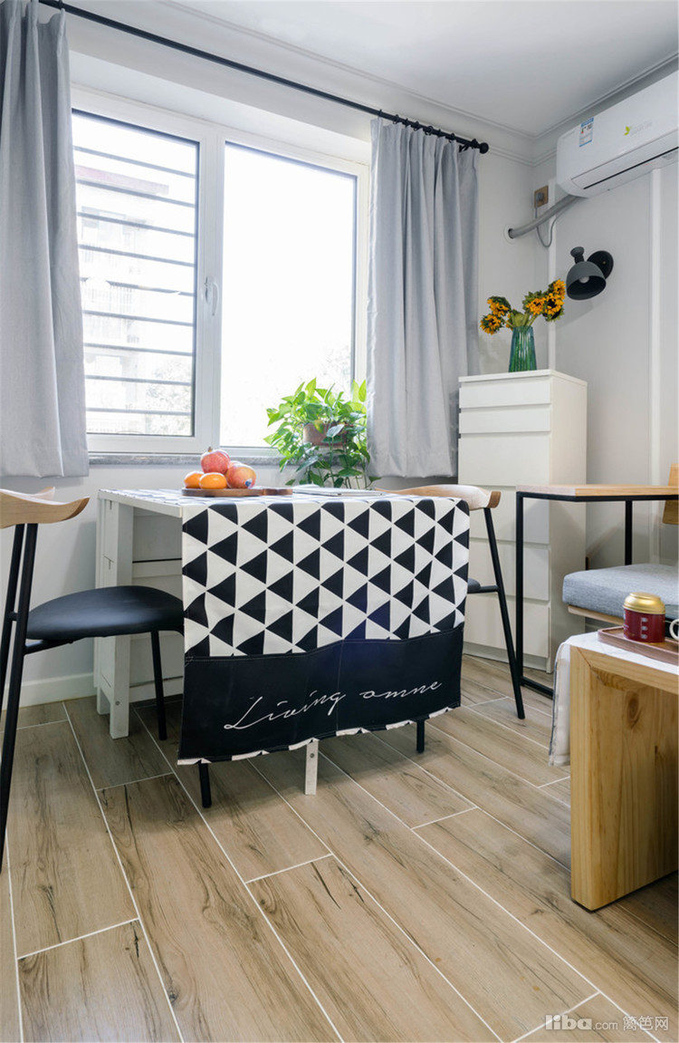餐桌是老房子以前用的宜家的折叠桌。配了两把黑色铁艺牛角椅。餐桌的顶棚处,安装明装筒灯,光晕将餐桌点亮。