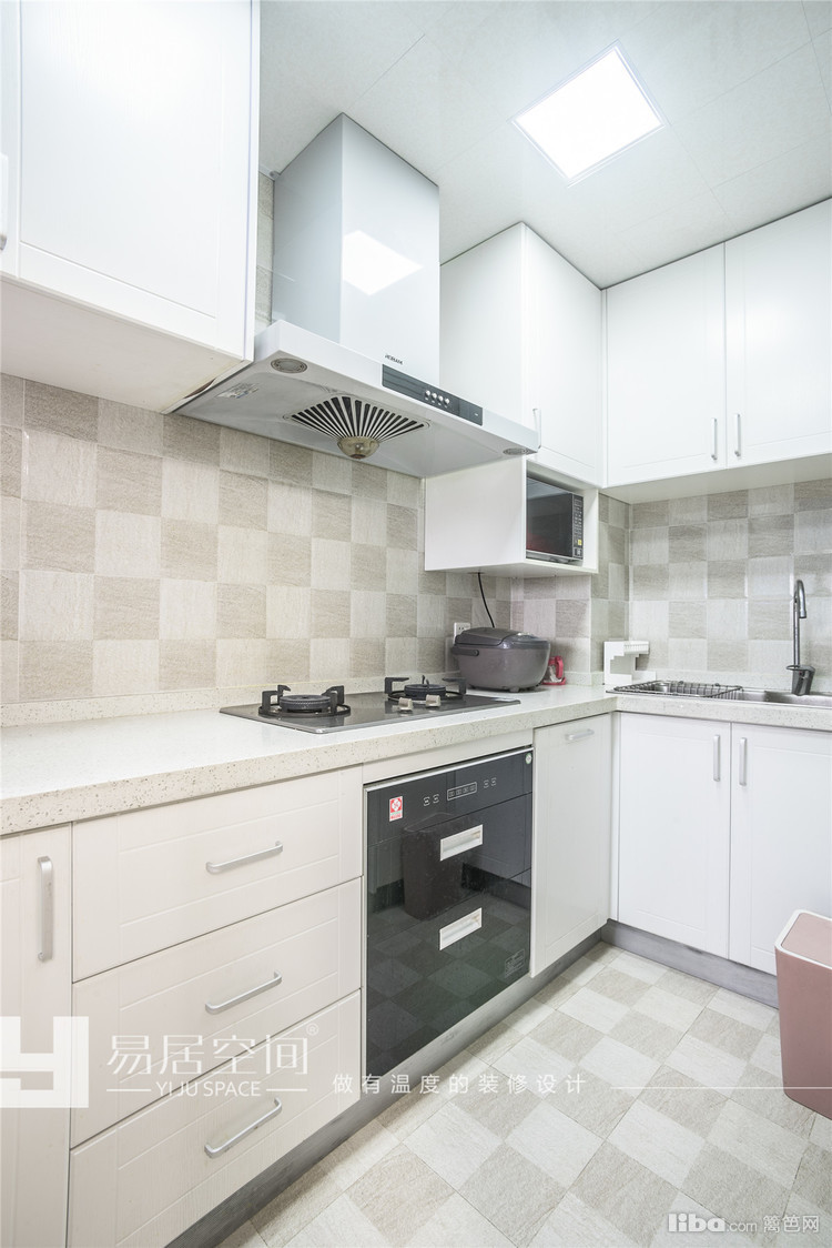 设计封闭厨房,白色橱柜搭配暖黄色面包砖显得空间明亮开阔。