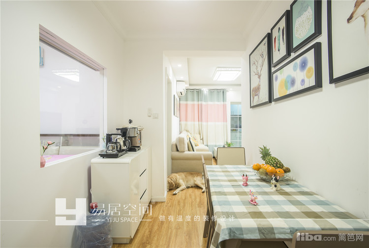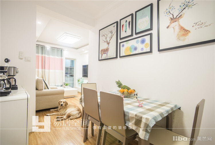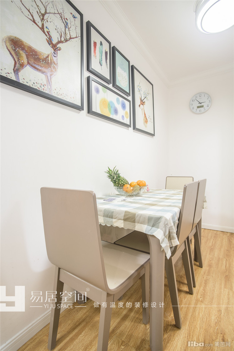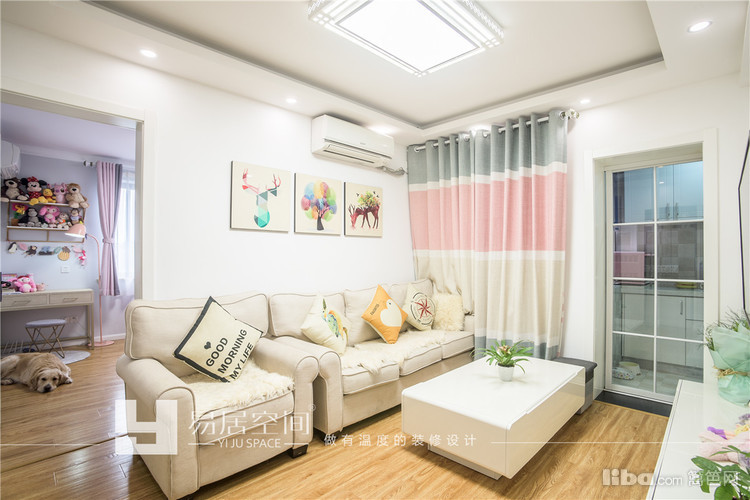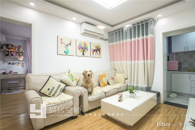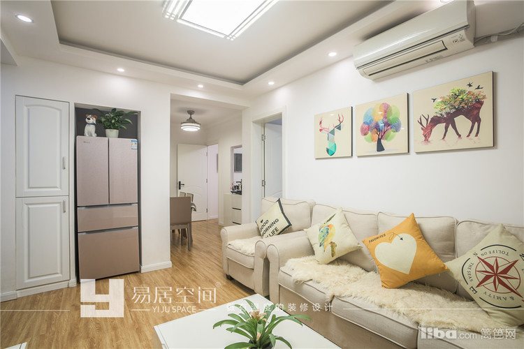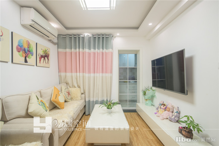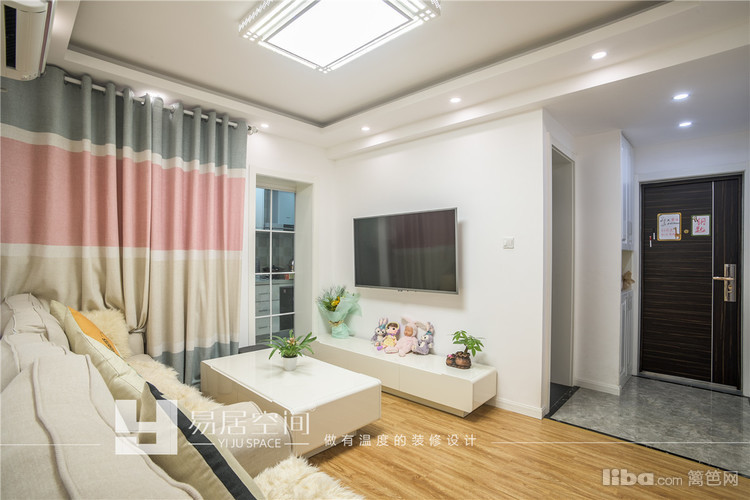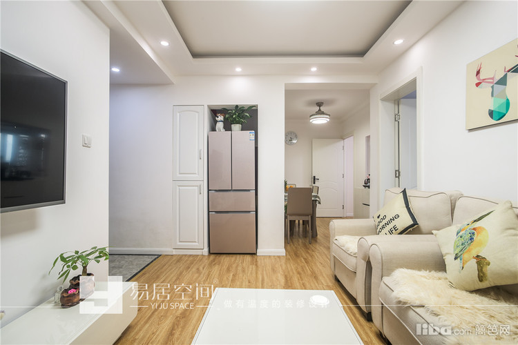 本案在北欧风格的基础上将整体色调变暖。客厅原视距2.7米,卫生间墙体内移,让出空间后视距是2.9米。全屋暖色系,白色家具,搭配米色沙发。简洁的现代空间,搭配彩色软装点亮空间。