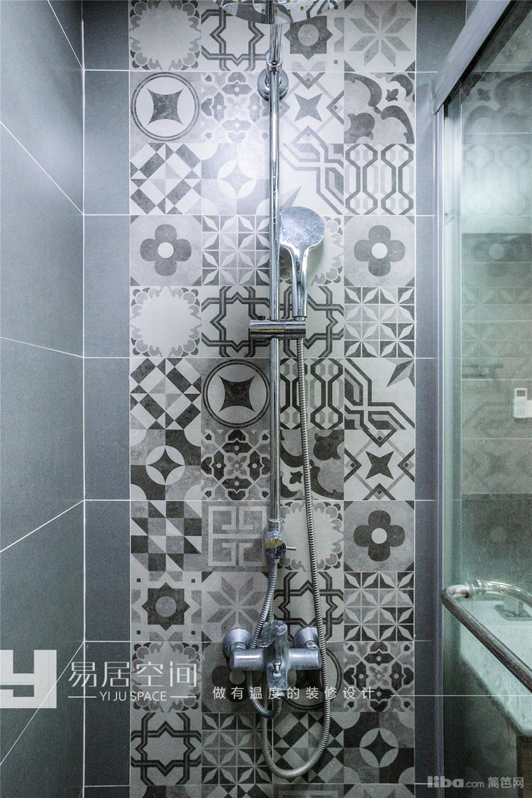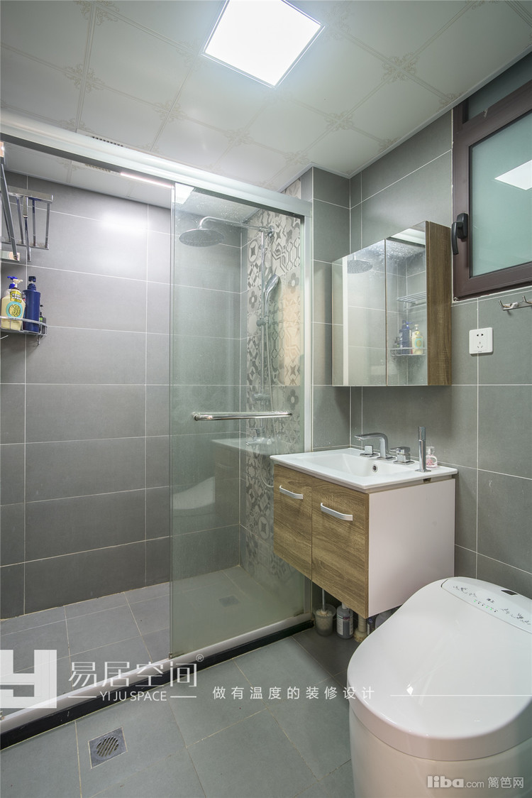 卫生间空间充足,墙地面灰色玻化砖,淋浴区花砖点缀,淋浴区独立淋浴隔断。原窗户太大改小后便于壁挂镜柜