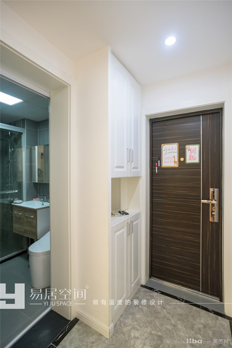 原地面大理石砖改为玻化砖。现场打造木工鞋柜,顶上采用石膏板吊顶,嵌入式筒灯照明,筒灯更具聚光性。