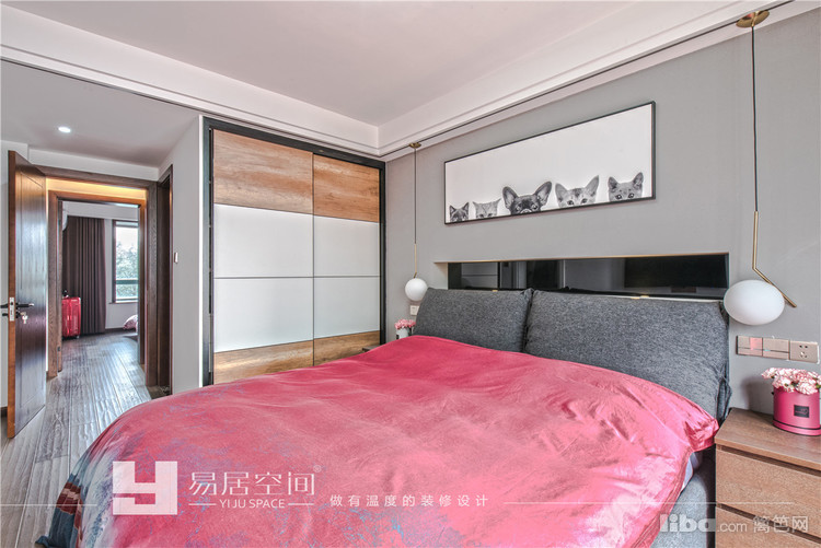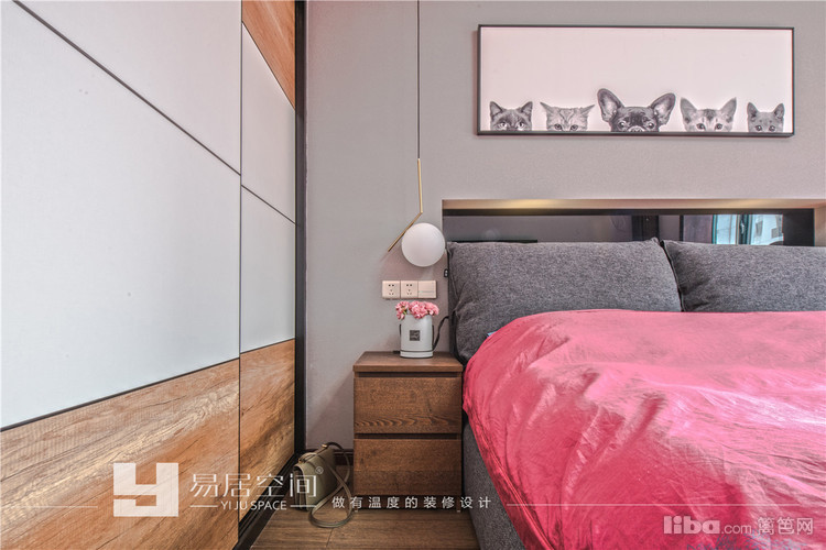 卧室选择了灰色的墙漆,因为是新婚所以床品还充满着幸福感的红色。因为怕黑,需要微弱的灯光才可以安睡。床头背景墙做壁龛,内嵌灯槽和镜面装饰。平时也可以摆放物件。