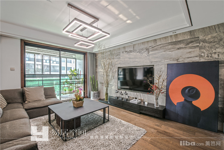 电视柜采用内嵌的方式,简易的回型石膏吊顶,黑色不锈钢线条封边,久处的舒适。