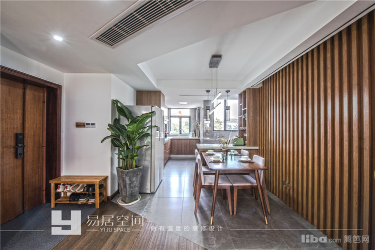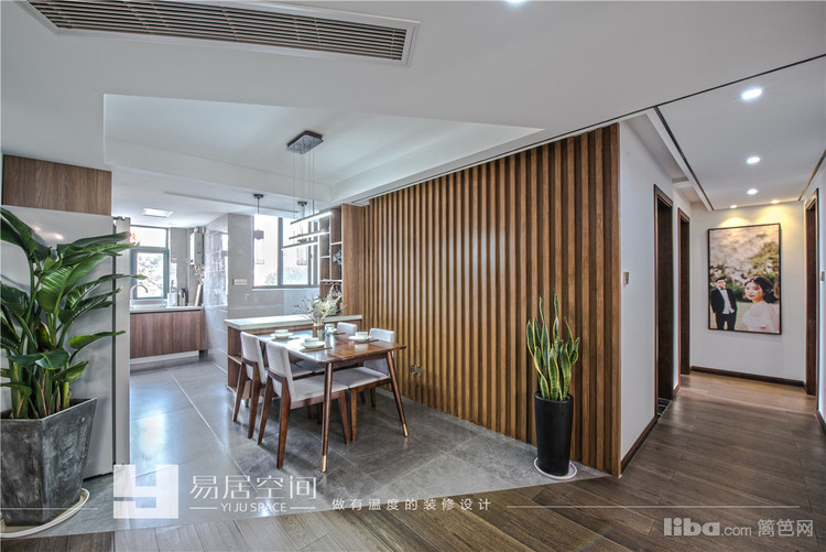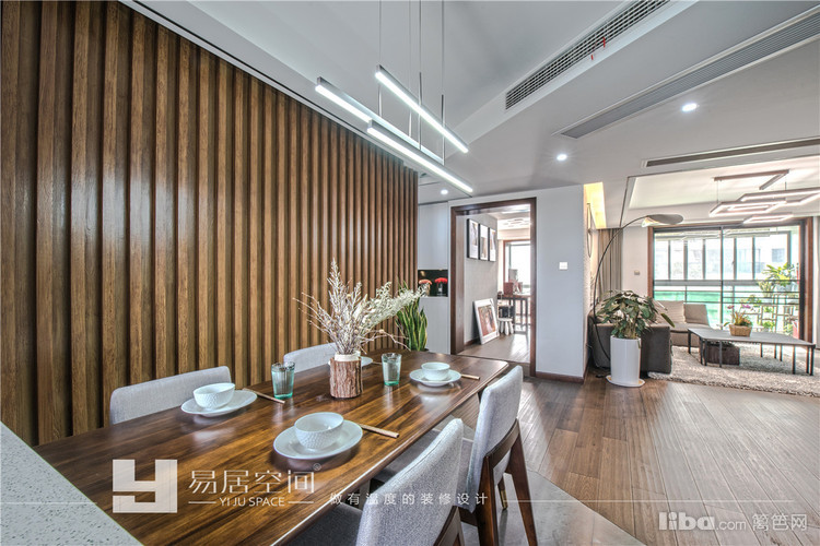 餐厅背景墙采用实木隔断,再做油漆面,采用的开放漆环保味道小而且价格比木饰面便宜许多。黑桃木的餐桌与背景墙色彩相呼应,欠缺的地方就是黑桃木不太耐热。