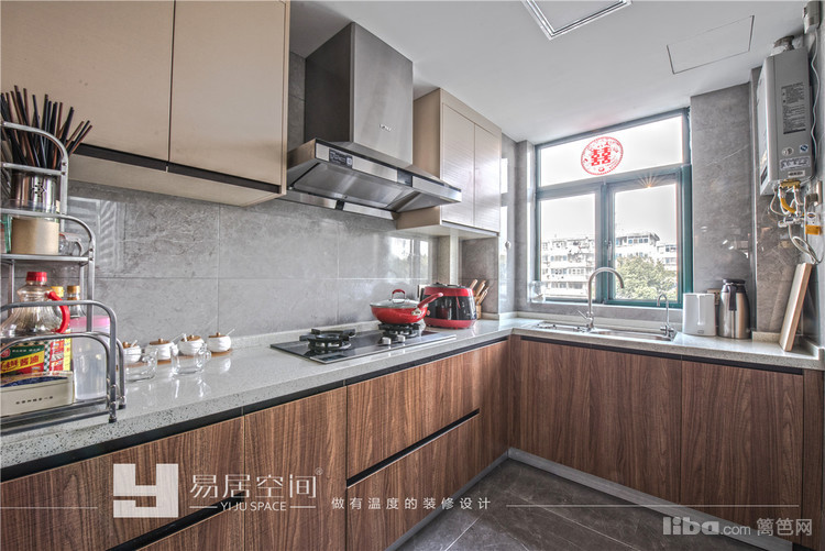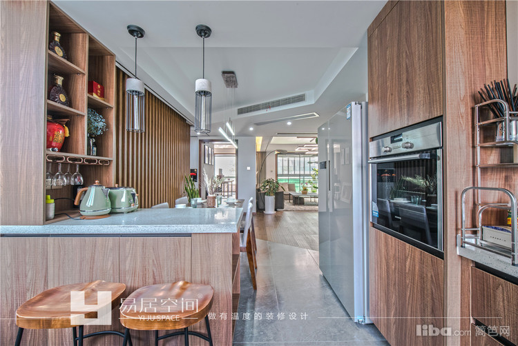 厨房打通成开放式厨房,还设立西吧台。整个客餐厨连成一线,增加空间采光,可以与休闲区有更好的互动交流。
