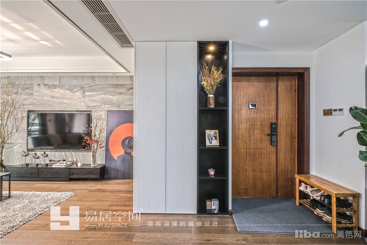 利用入户左侧的空间定制了整面高柜,用于小物件的收纳摆设及储物功能。右侧放置淘来的鞋凳,方便出门换鞋。