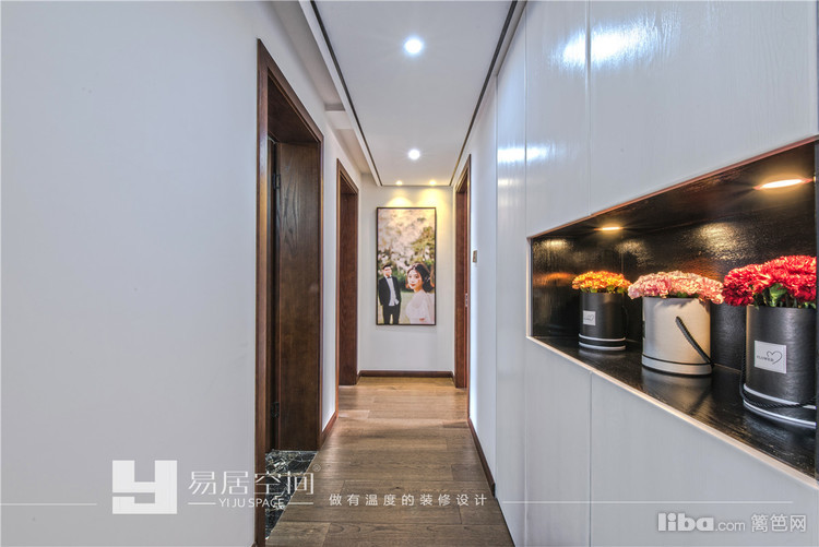 过道也是设计联排的壁柜,中空掏空,筒灯照明,设计师在过道吊顶上增加了两条很具有空间引伸感的细线。