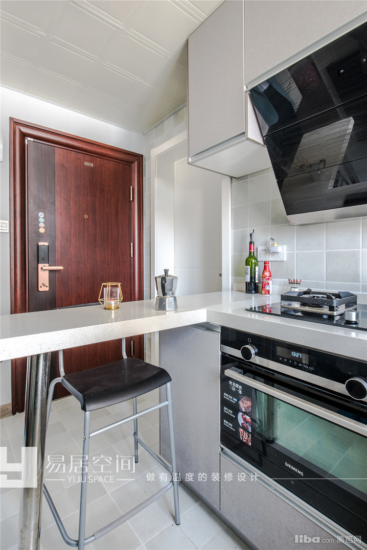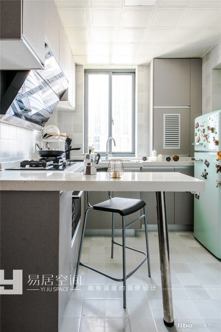 厨房台面使用大理石元素搭配灰色橱柜提升了整个空间的质感,开放式厨房与餐桌融为一体。