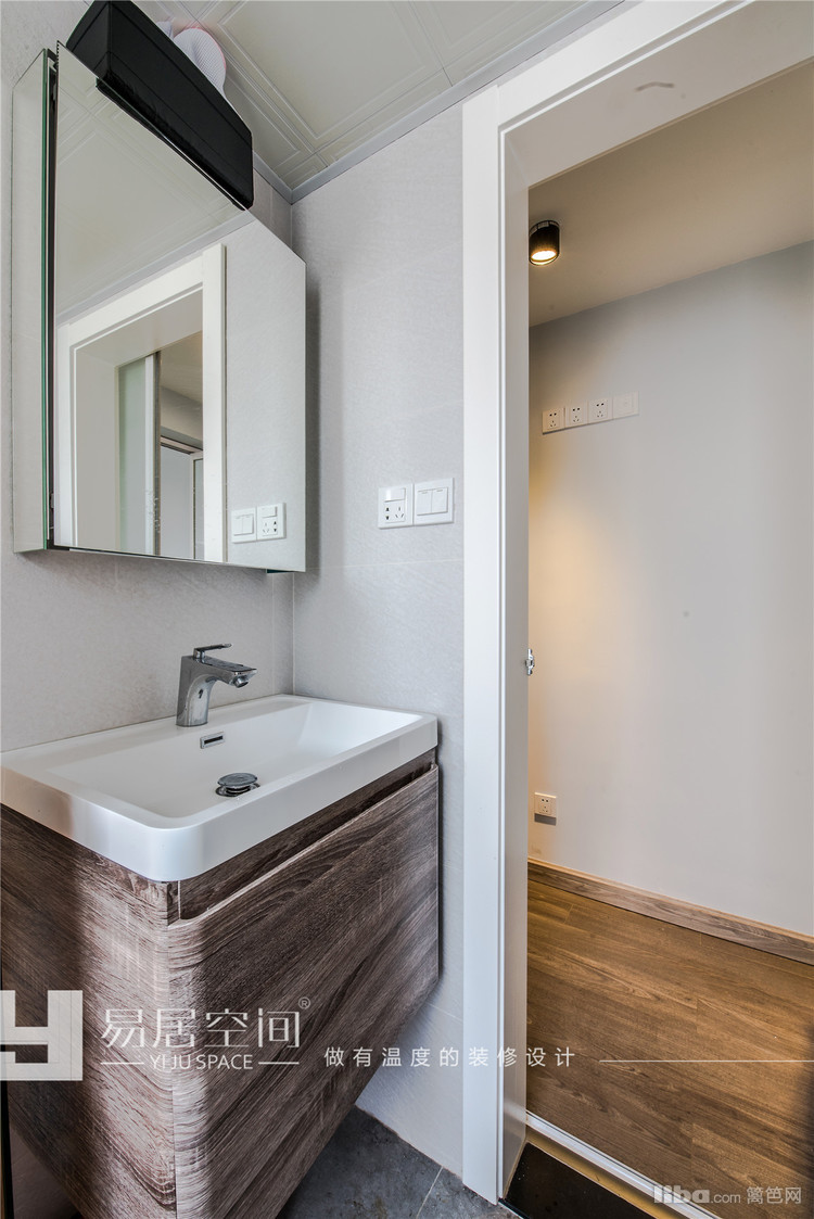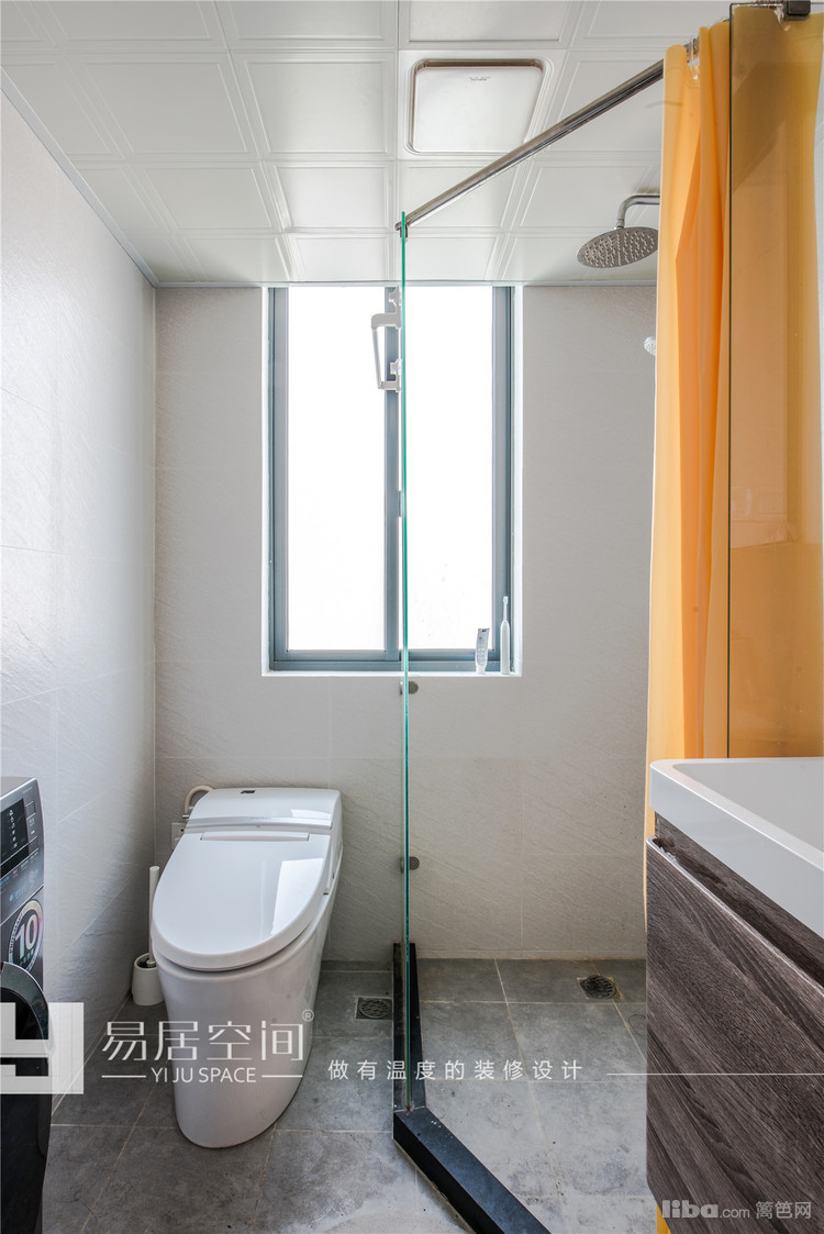 卫生间瓷砖采用30*45白色哑光釉面砖搭配30*30灰色仿古砖。明亮通透