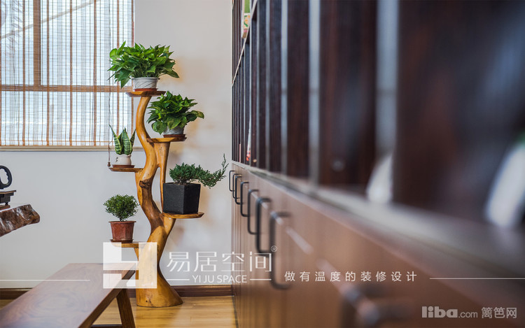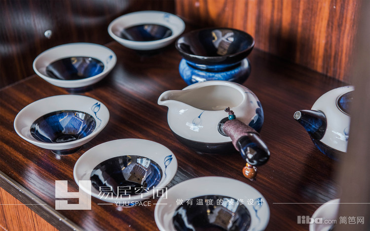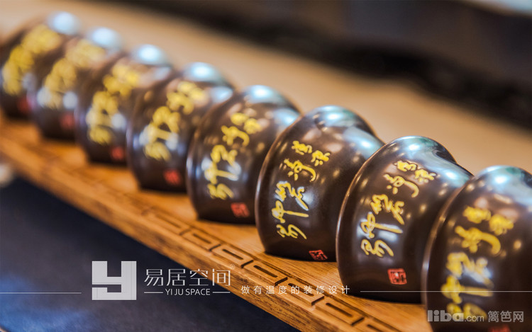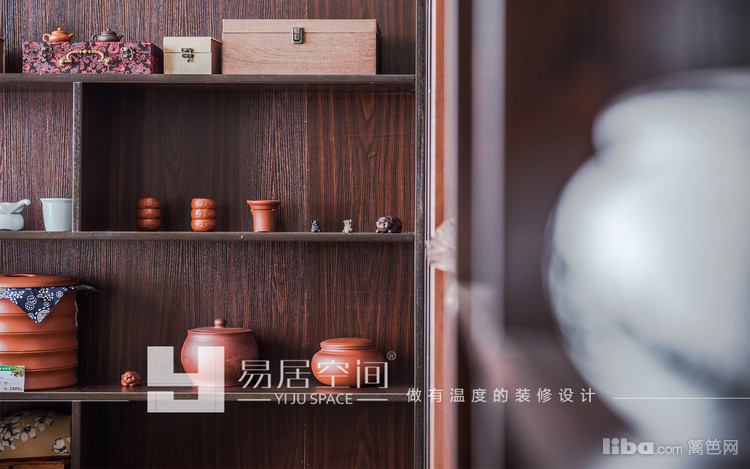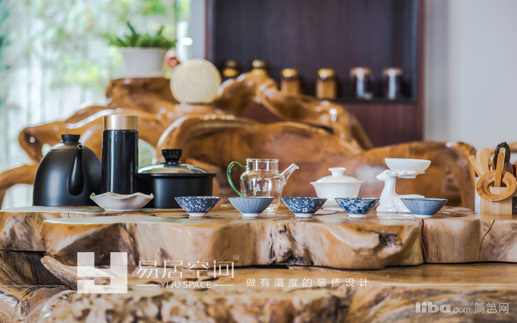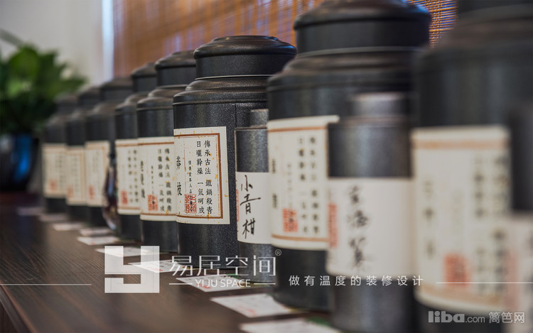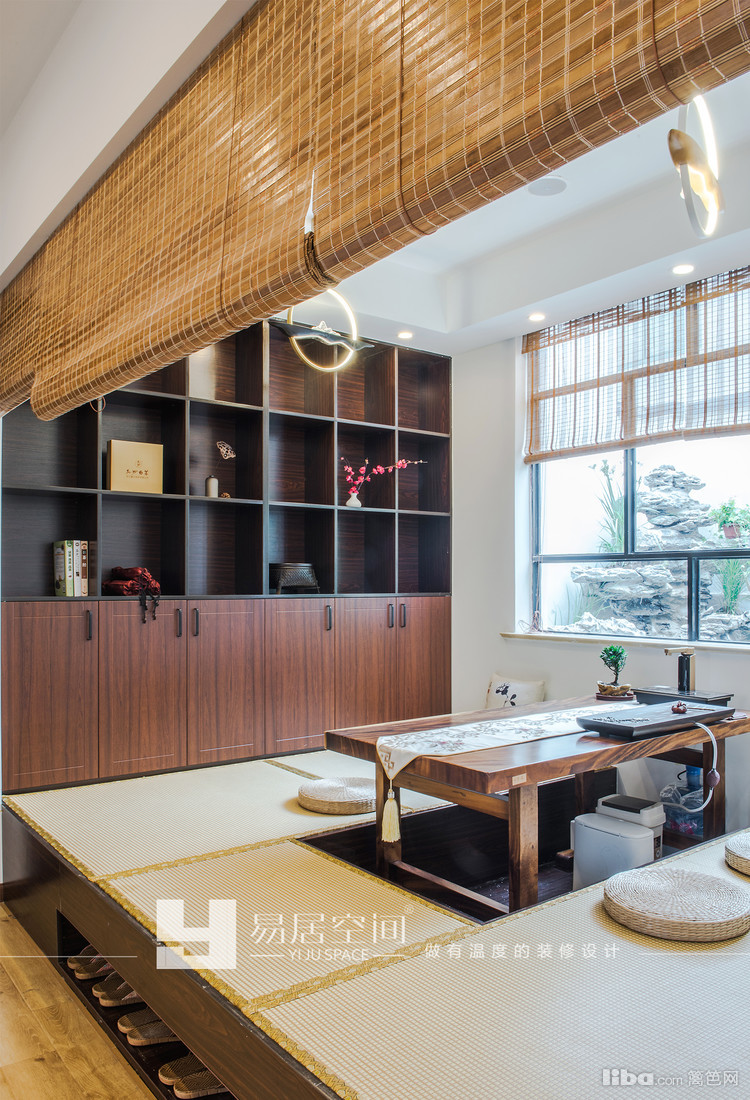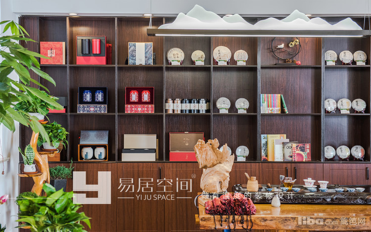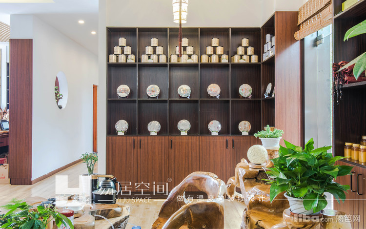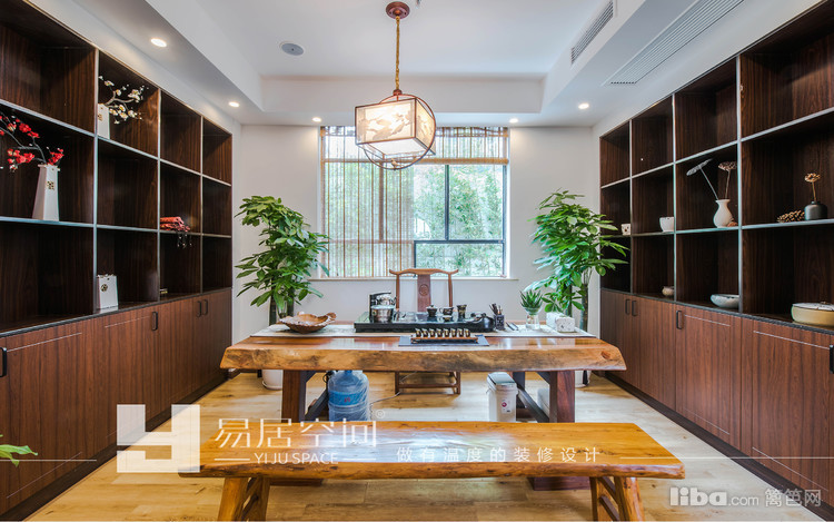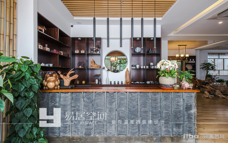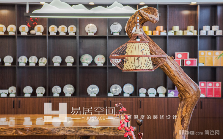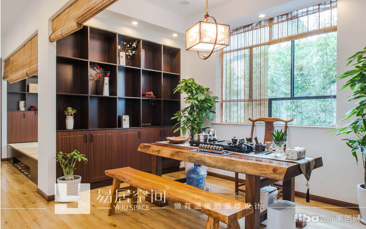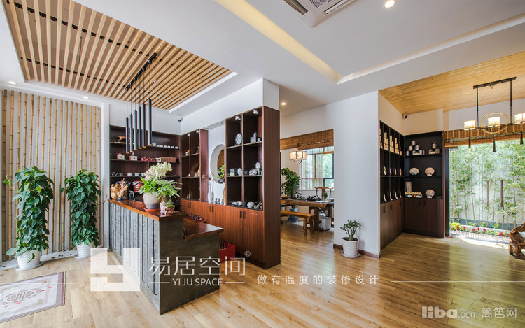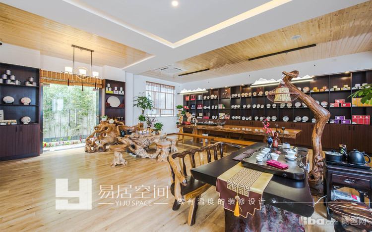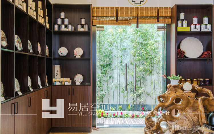 两侧的展示柜可以摆放一些茶品、茶具,干枝花做点缀,窗外有假山流水翠竹,可以品茶、洽谈、赏景