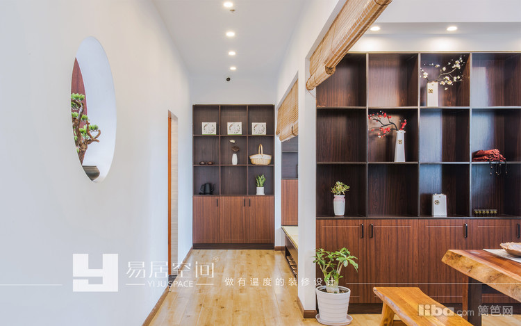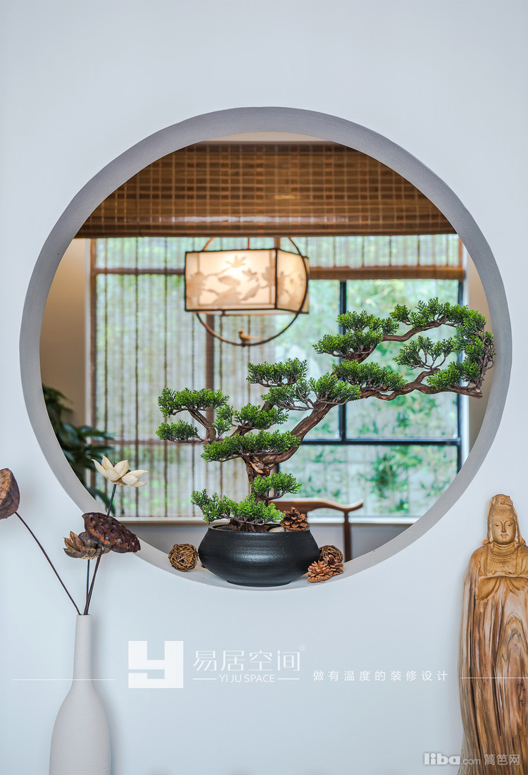 中国讲究天圆地方,入室玄关这一巧妙的圆窗设计,摆一盆迎客松,与远景的鸟儿翠竹遥相呼应。