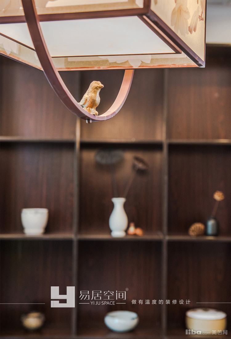 这是一个比较中正的包间,符合中式的方正,对称美,茶台正上方装了一盏新中式禅意小鸟吊灯