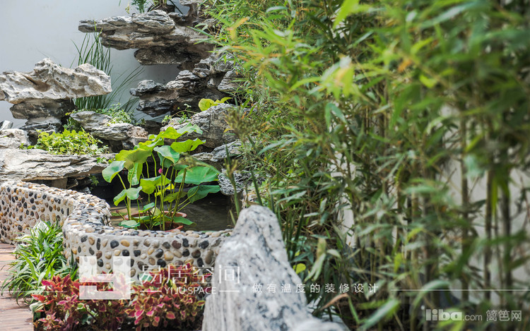 后院:白色的小碎石和假山流水,水里游着几条嬉戏的小金鱼,郁郁葱葱,也成为了一处窗外景致。