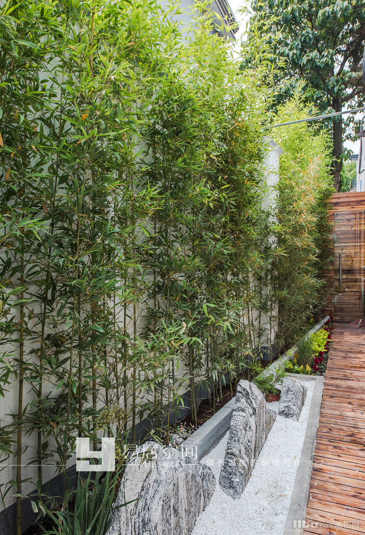 后院:利用屋后一片荒废的排水区,地上找平后过道位置铺上防腐木,靠墙种上一排翠竹