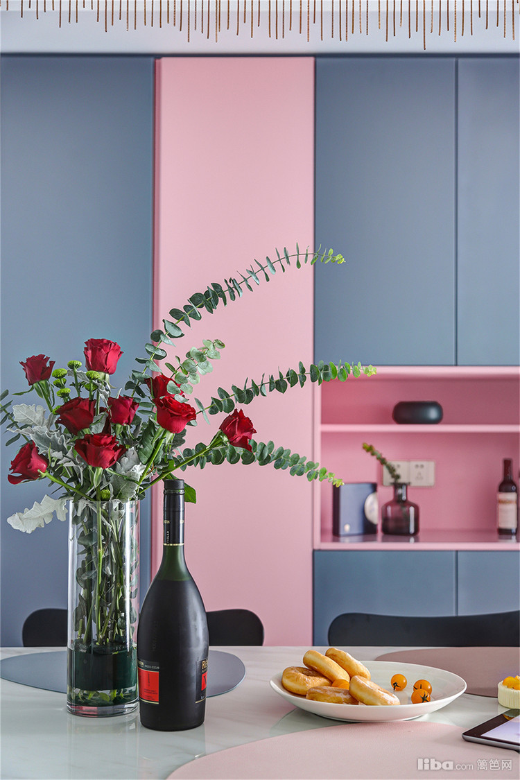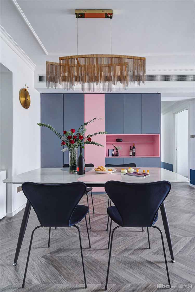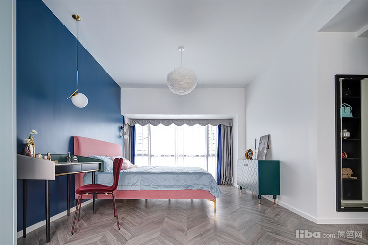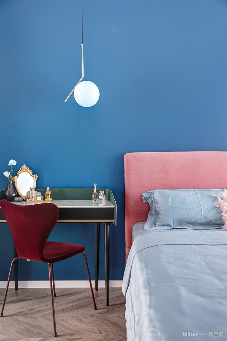 主卧,最令人拍案叫绝的是粉与蓝的碰撞!当低饱和度的烟粉色遇上浓烈明亮的蓝色,对比鲜明却又和谐融洽,展现出张扬的浪漫。