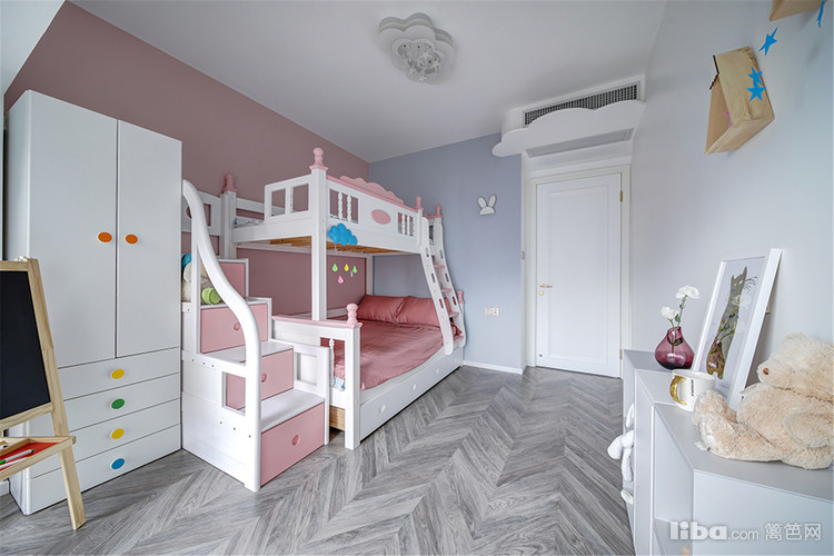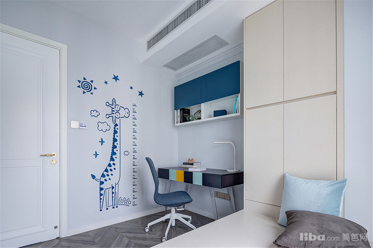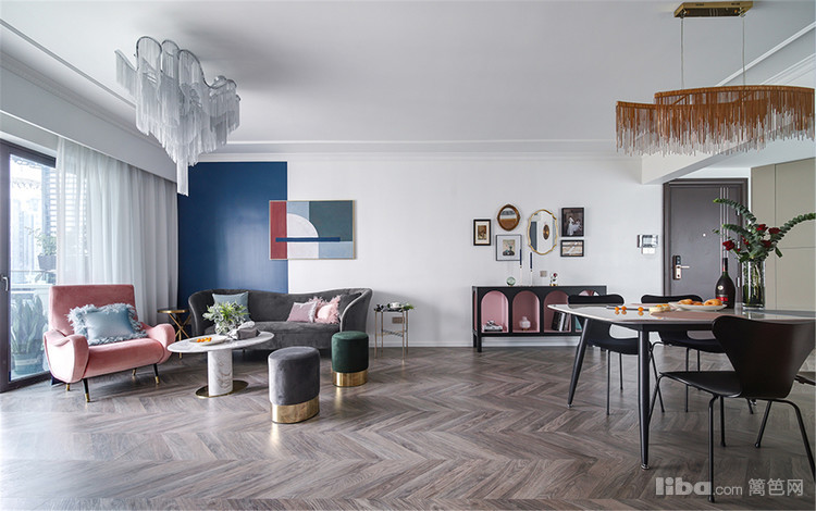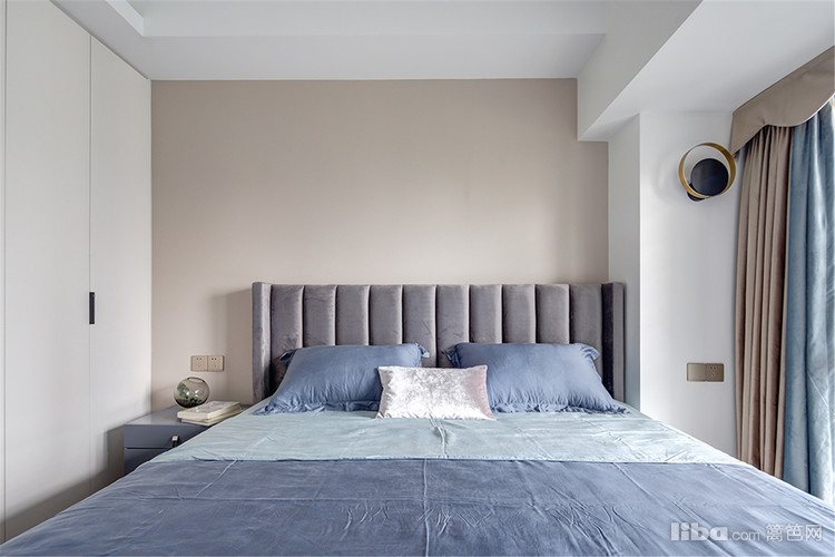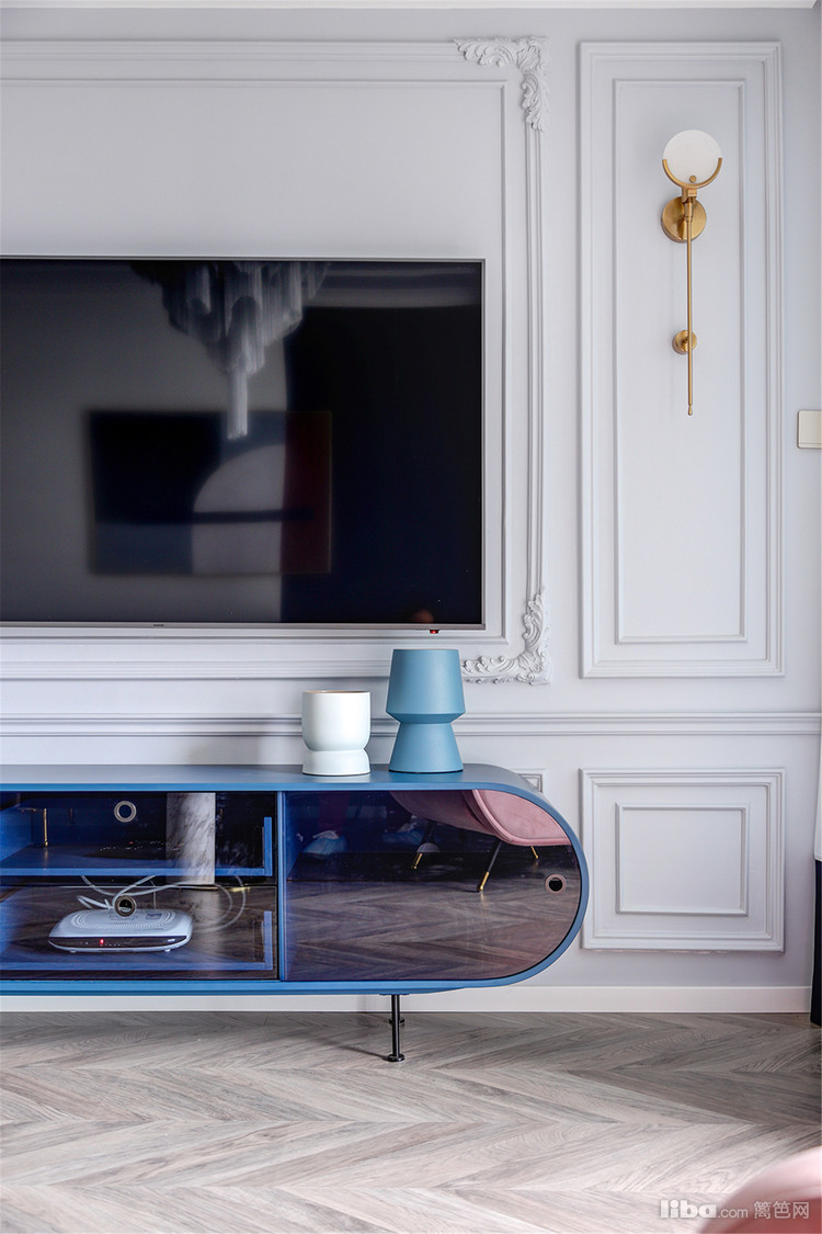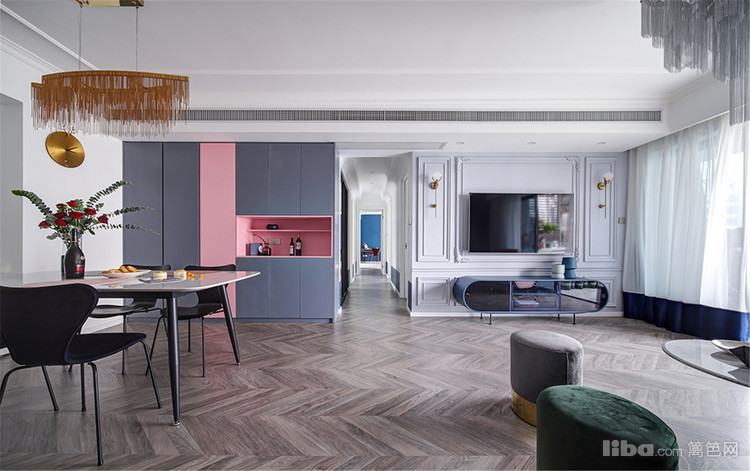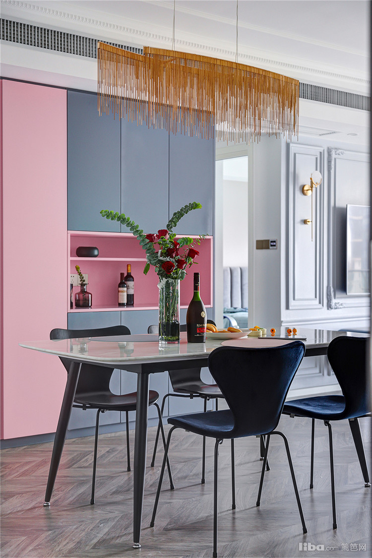 主卧,最令人拍案叫绝的是粉与蓝的碰撞!当低饱和度的烟粉色遇上浓烈明亮的蓝色,对比鲜明却又和谐融洽,展现出张扬的浪漫。