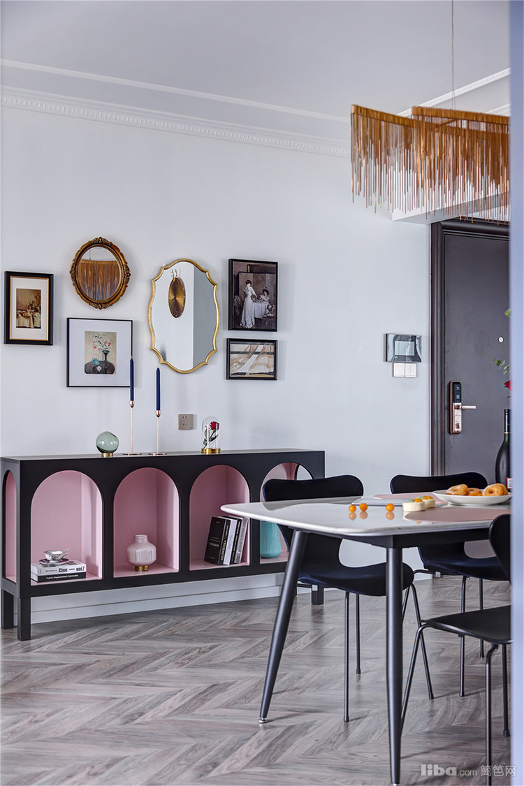 餐边柜上悬挂六项规格不一的装饰,既有家庭场景的复古油画又有精致典雅的镜子,看似毫无关联,但都极具生活气息,精心设计过的排列方式也让餐厅增添了别样的美感,成为家中一道亮眼的风景线。