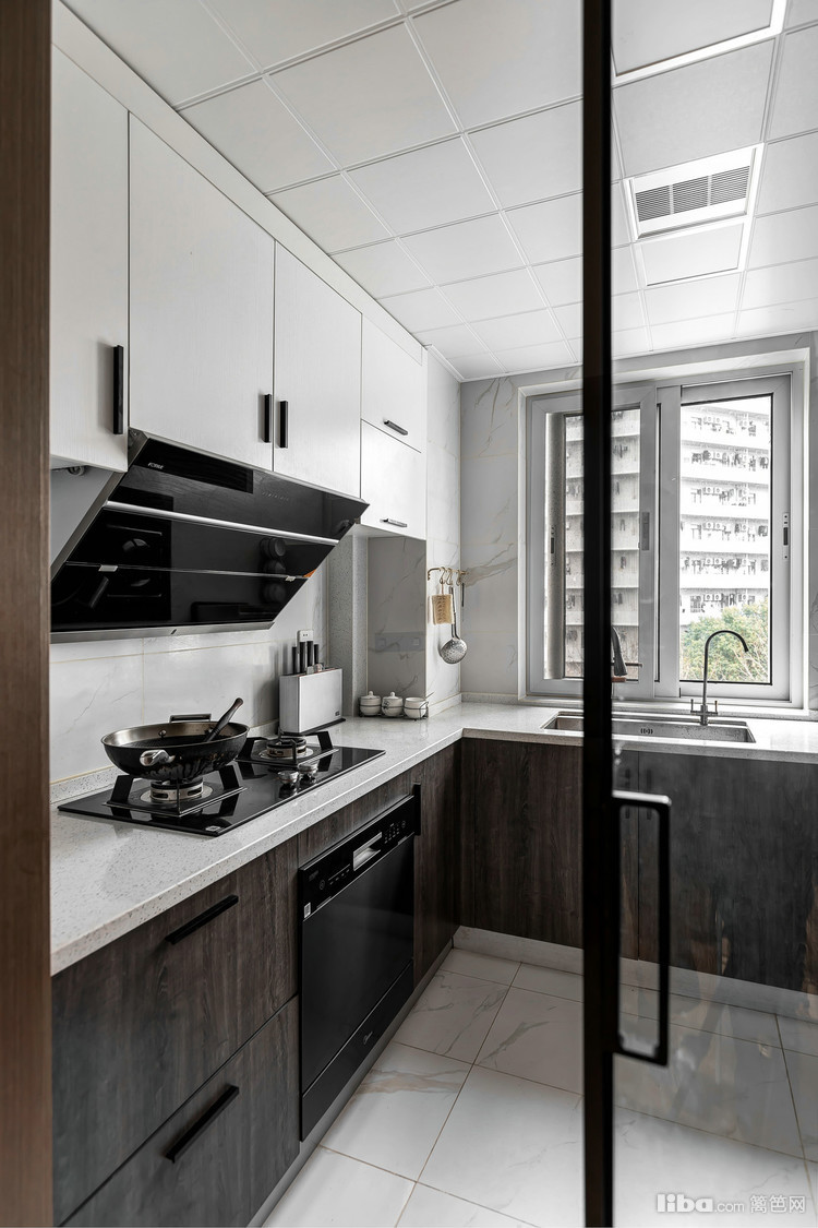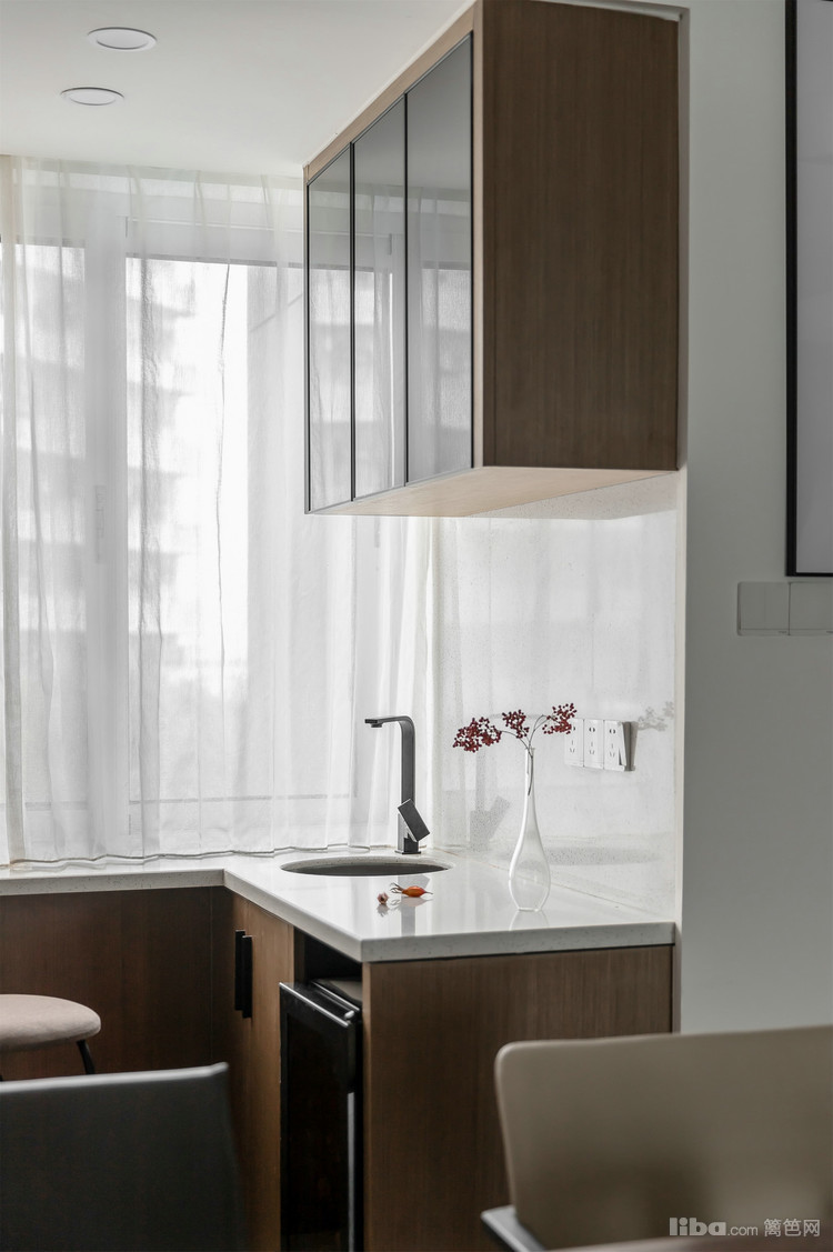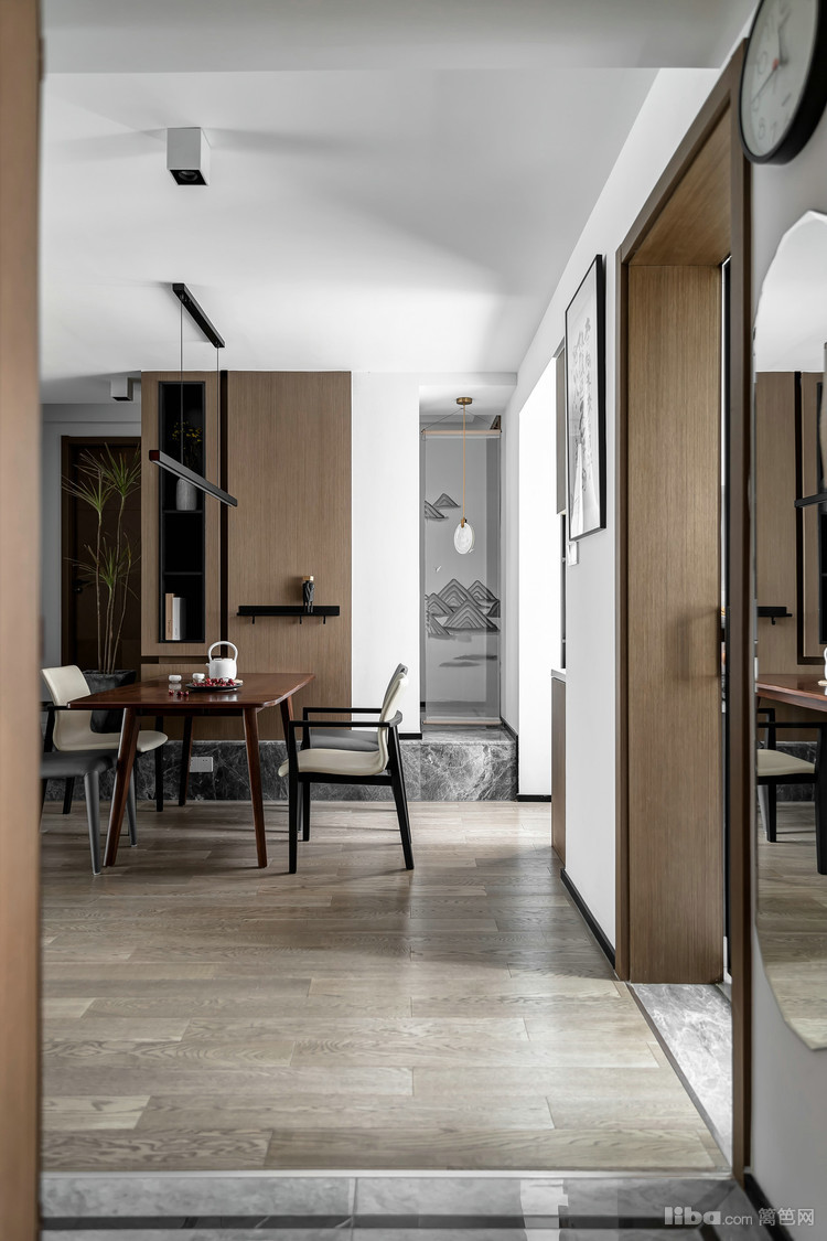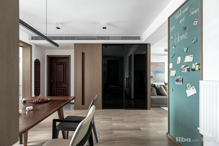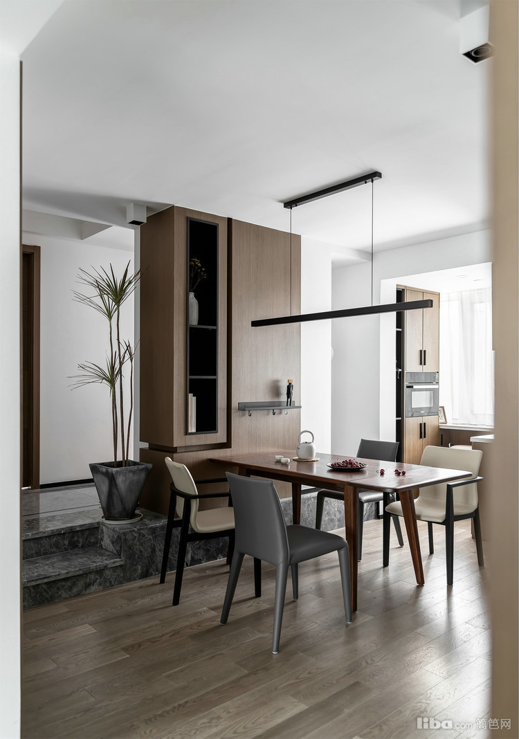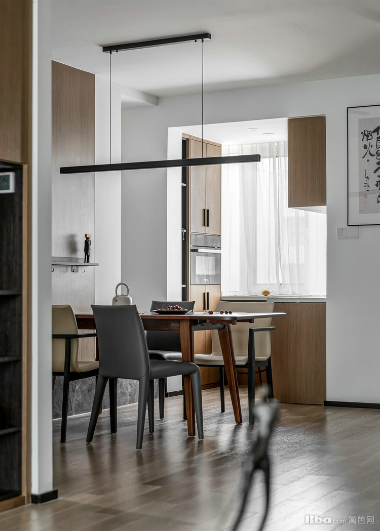 餐厅是连接各个空间的主要区域,餐桌靠墙放置,释放空间。墙面采用KD板饰面,穿插黑色层板架,作为餐厅区域的主要展示和收纳