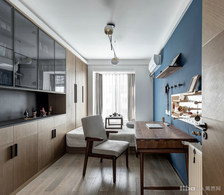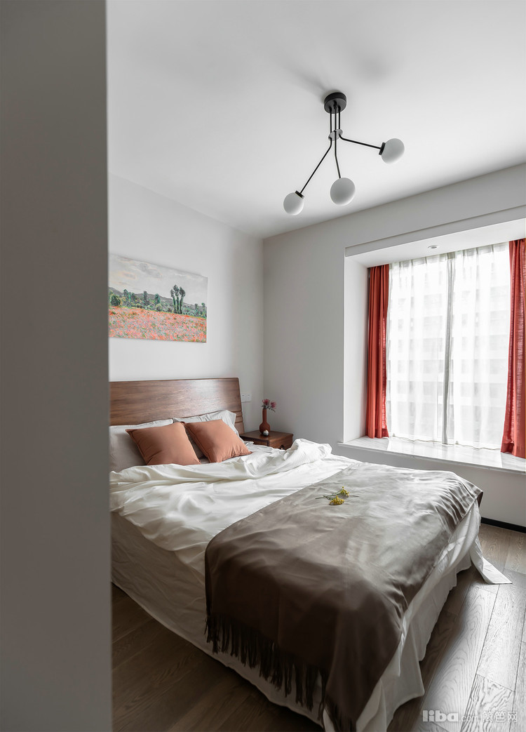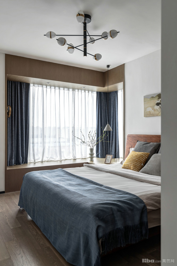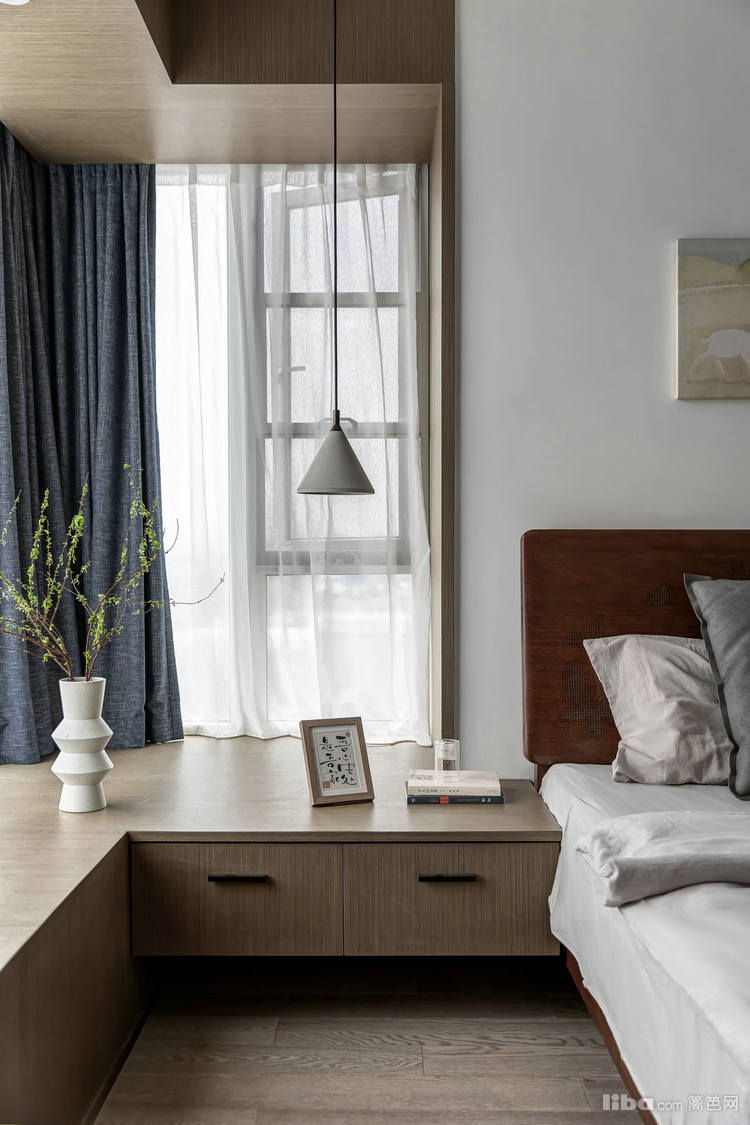 主卧与公共空间统一,沿用了木饰面材料,将整个L型飘窗包裹,整体格调素雅