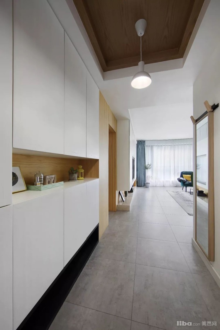 白色置顶的玄关柜,中空层摆上精致的小饰品,与底部黑色搭配出时尚的风格,简洁的穿衣镜的摆放,使空间简洁又不失情调。