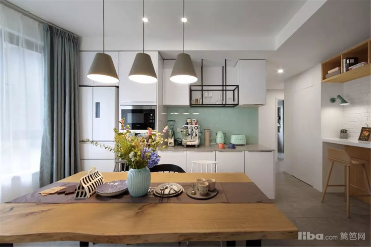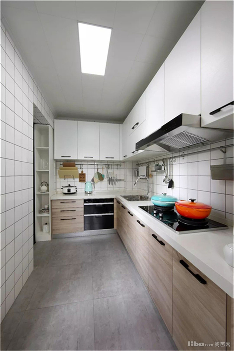 中厨呈L型设计,宜家的墙面挂杆是收纳小帮手,一些小物件上墙,让厨房桌面更加整洁、干净。
