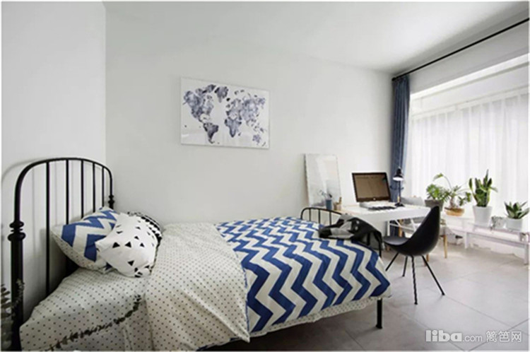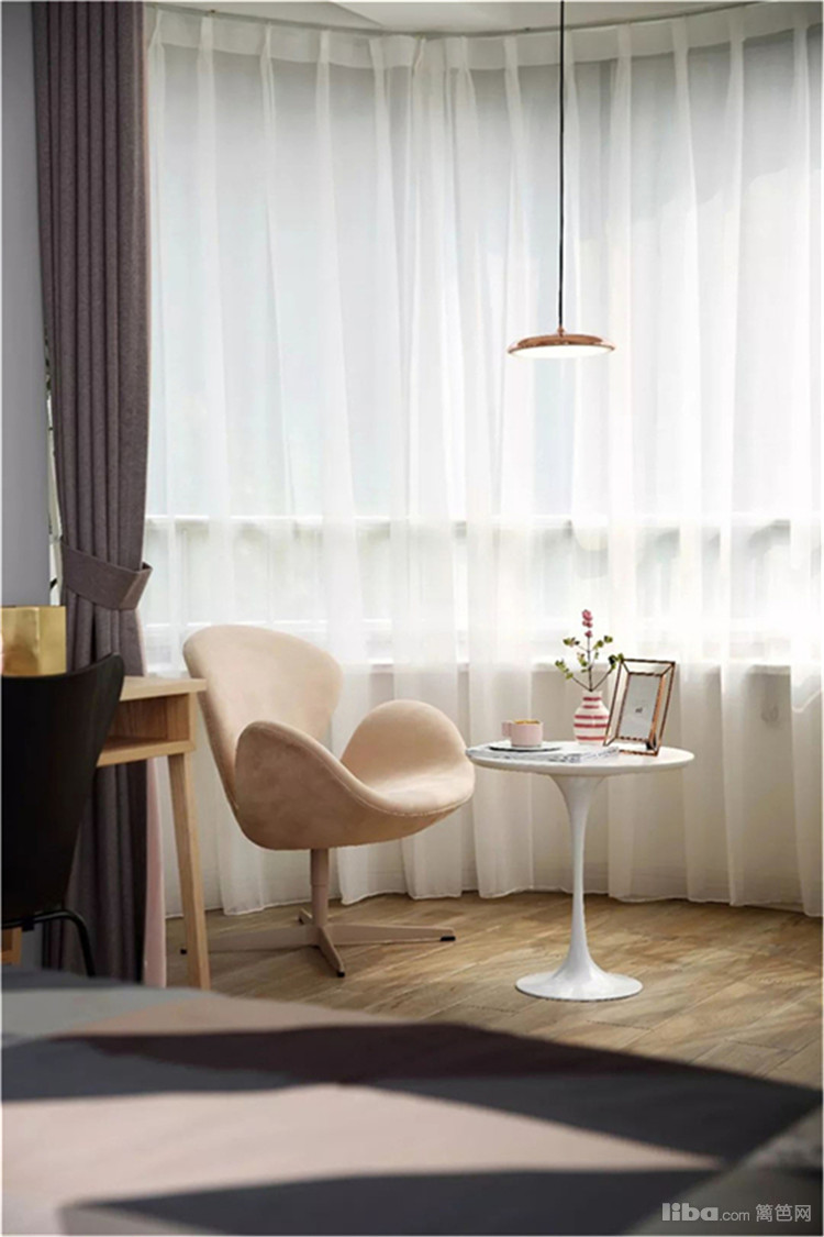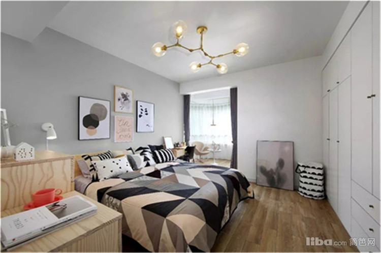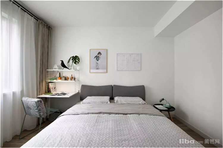 床尾做了整墙衣柜,满足整个家大部分的收纳需求,白色柜体搭配黄铜色小把手,显得小巧精致。