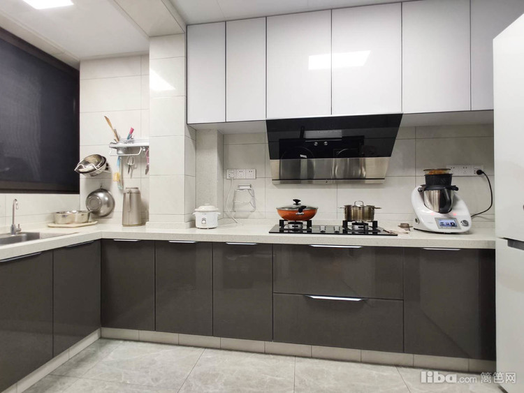 打通原厨房的阳台使得厨房整体空间感比以前大很多,吊柜的设计让小空间的收纳功能变强,白色,干净舒适。