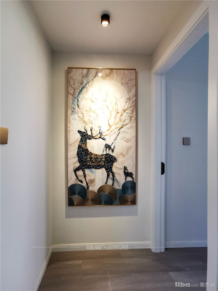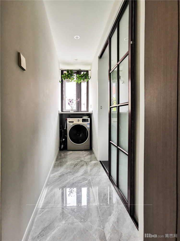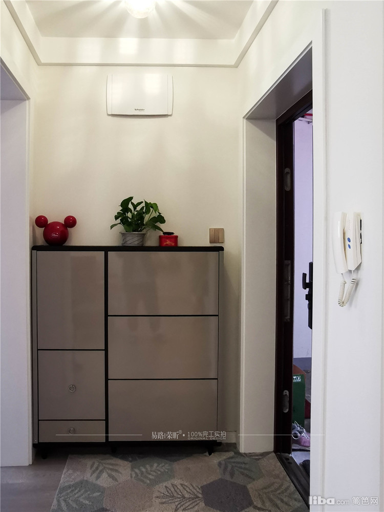 玄关,由于门厅狭小,选用超薄型翻斗鞋柜,正好与门柱持平,不占地方,顶层又能置物。