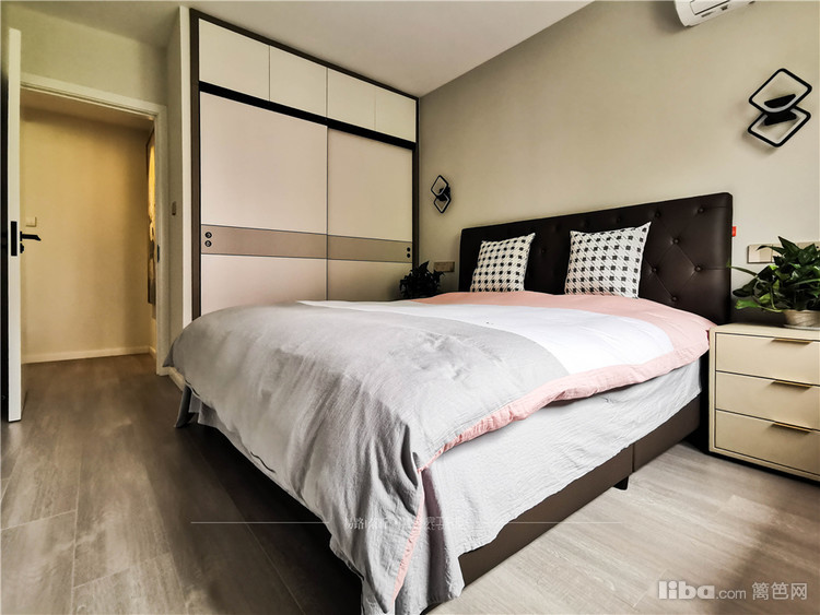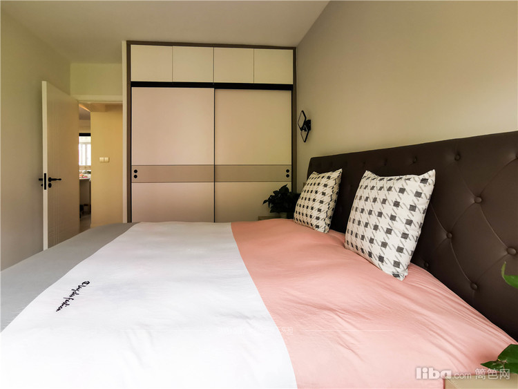 主卧中的粉色带来了清新甜美的气氛。深褐色的床显得沉稳大气,几何形的壁灯简洁时尚。