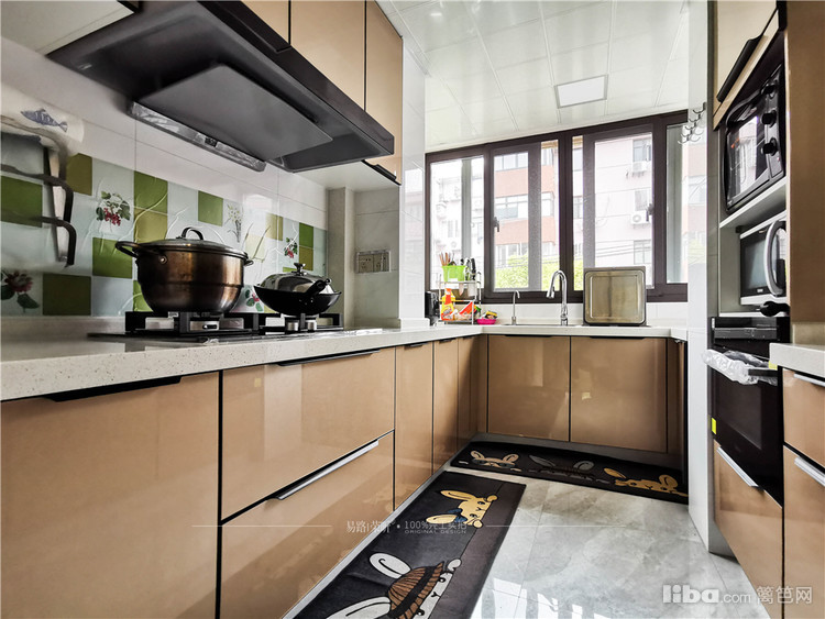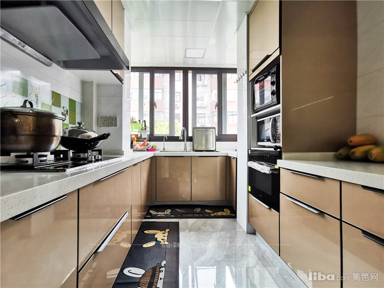 对厨房空间进行了整体规划,加以灵活使用。将阳台一分为二,扩大了厨房的使用面积,U型设计功能区布局合理。