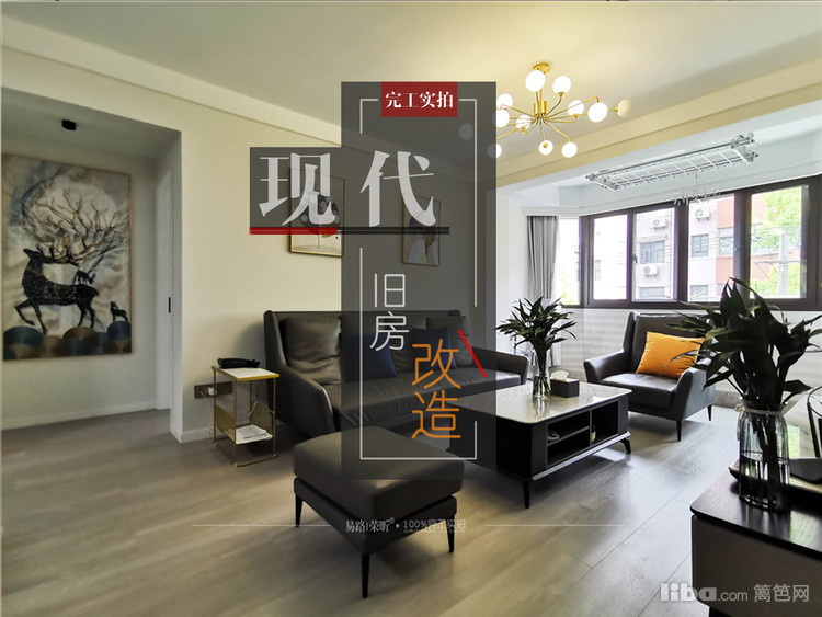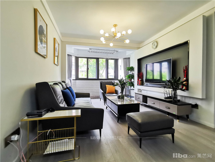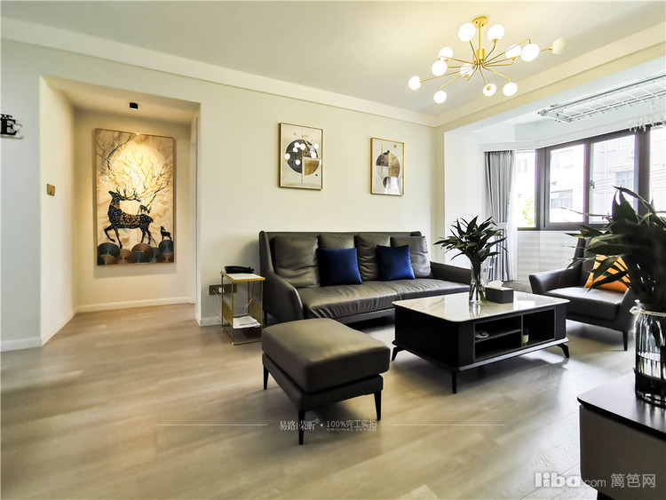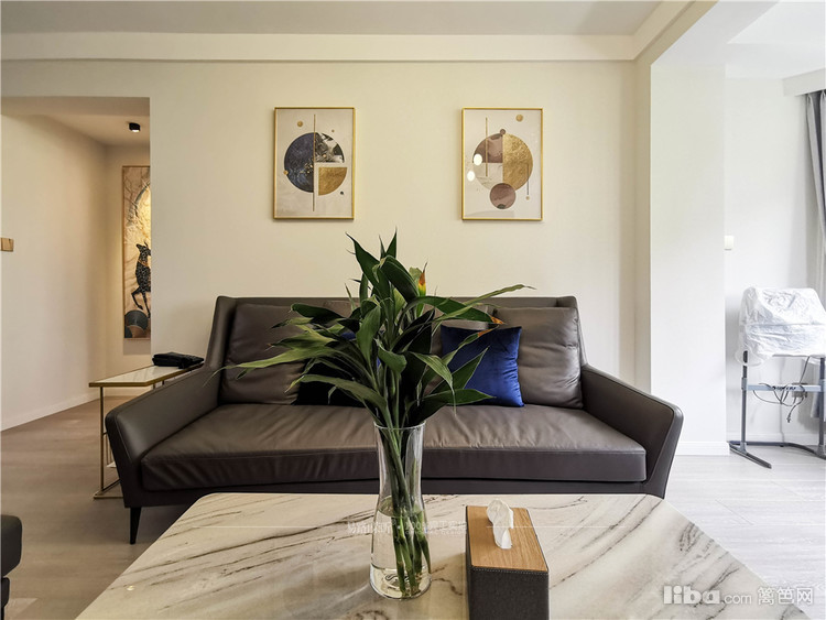 客厅以白色为主,搭配浅色木板与深色的家具,以金色为点缀,突显了空间层次感与立体感