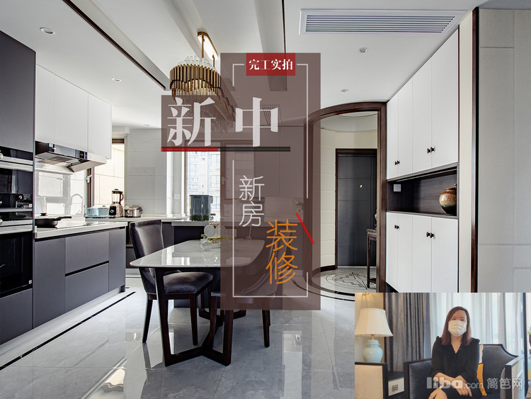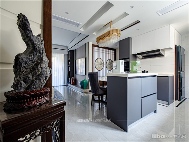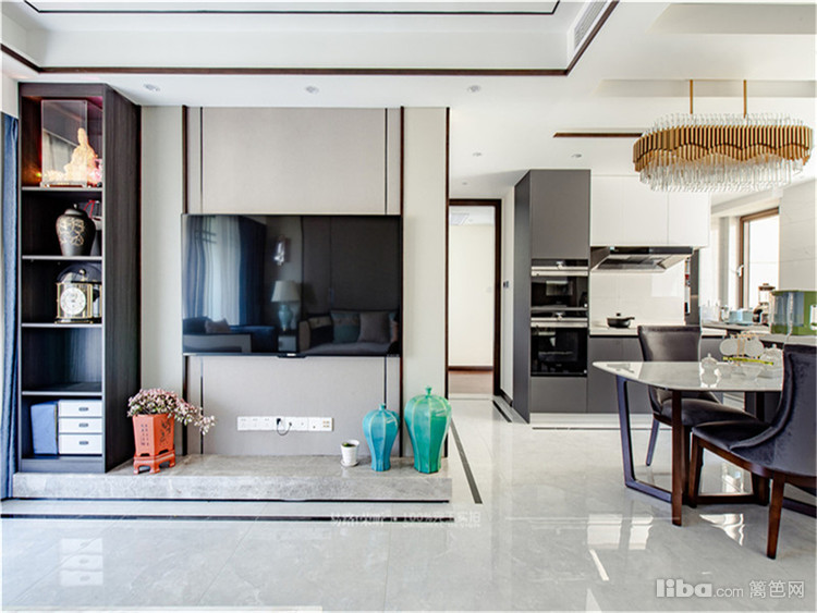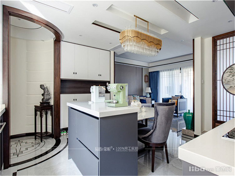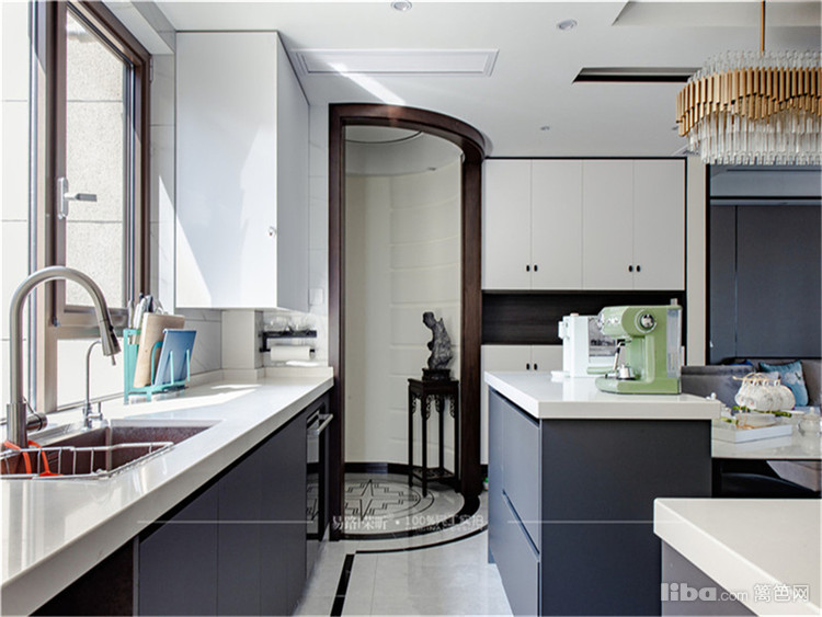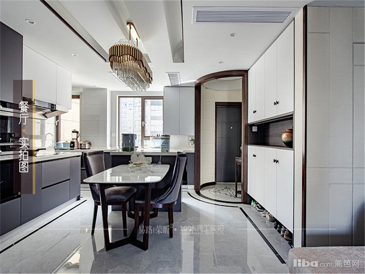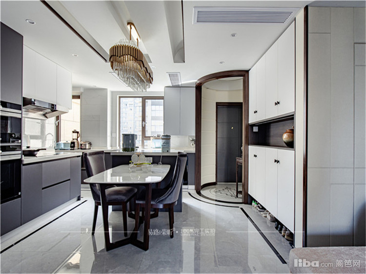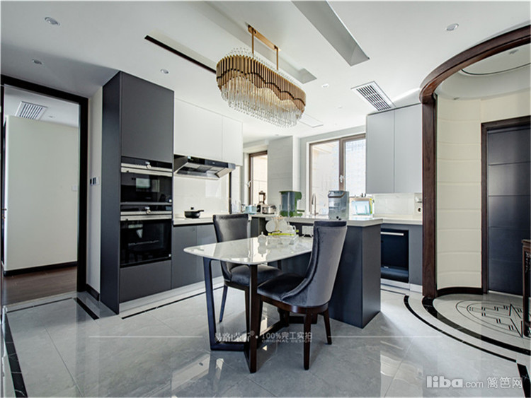 开放式的厨房与餐厅连成一体,有种将餐厅包进厨房的感觉,动线设计很方便。简洁的白色与沉稳的深色,搭配精致的金属色水晶吊灯为空间融入时尚的气息,自由舒适,明亮而大气。