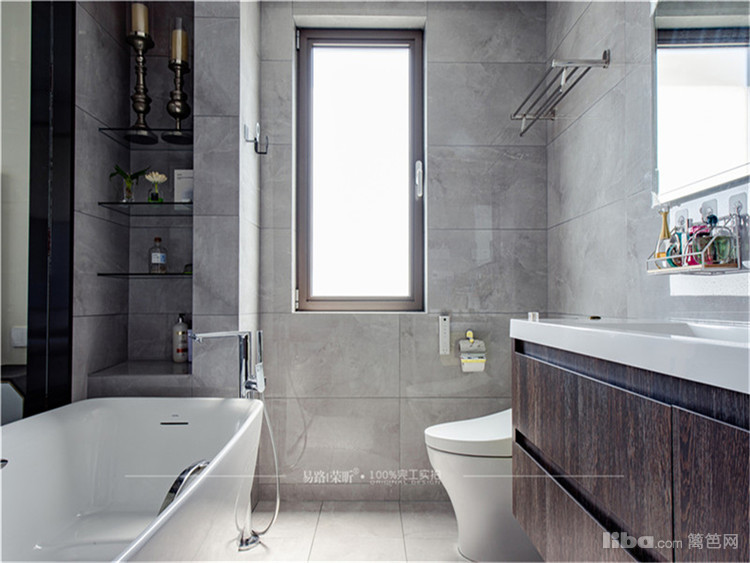 卫生间地砖墙砖都有着泼墨般的纹路,别具质感,与深色的卫浴柜搭配,丰富了空间的层次感。