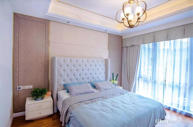 卧室同样做了对称的设计,软包的床头靠背和硬包的背景墙,米色与棕色的结合,加上金属线条的点缀,整个主卧给人一种清新、素雅的感觉。