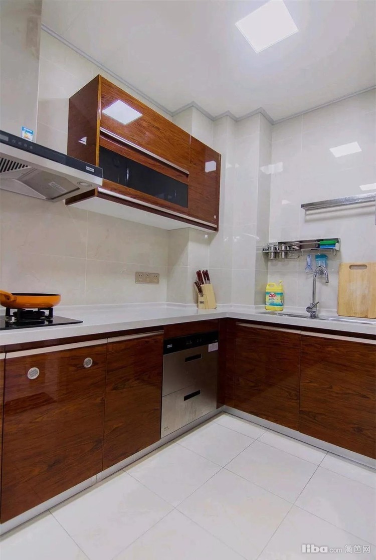 厨房处做了深木色的橱柜,与浅色的墙地面形成一种对比感,让人感觉干净整洁,墙面减少了部分吊柜,更显宽敞。
