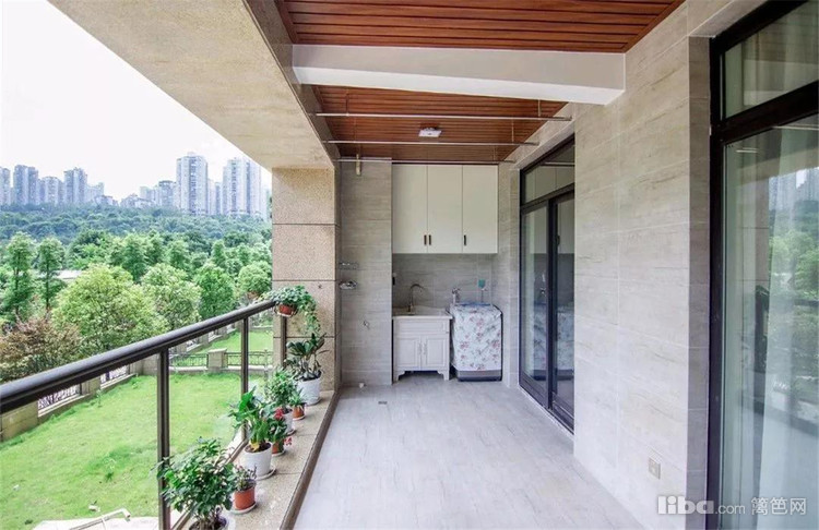 开放式的阳台,在阳台的一侧摆放洗衣机和洗手台,上方做升降式晾衣杆,护栏下方还可以摆放绿植。