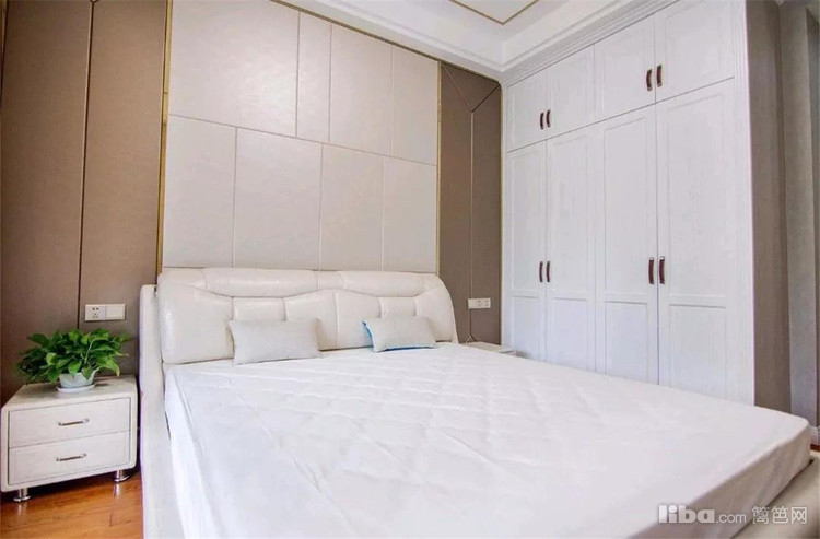 次卧的设计和主卧大部分相同,整体皮质的床和白色的衣柜、床品结合起来,展现出简洁的风范。