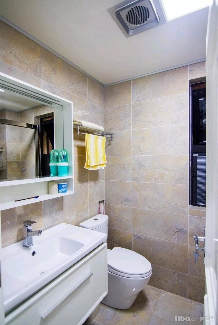 卫生间内部设计也非常简洁,直接购买成品的浴室柜、镜子和马桶,做旧款的瓷砖让卫生间多出了美式风的感觉。