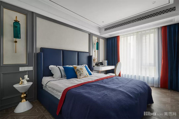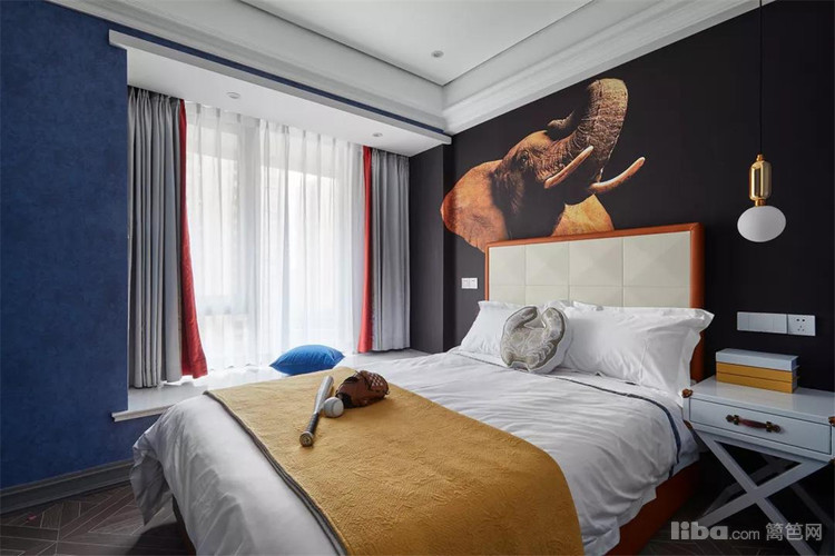 卧室内是米字拼的地面,床头墙的布置与客厅沙发墙如出一辙。床铺和窗帘的色调洋溢着充沛的活力气息。而床头两边分别是沙漏型床头柜和书桌,兼顾收纳性和实用性。