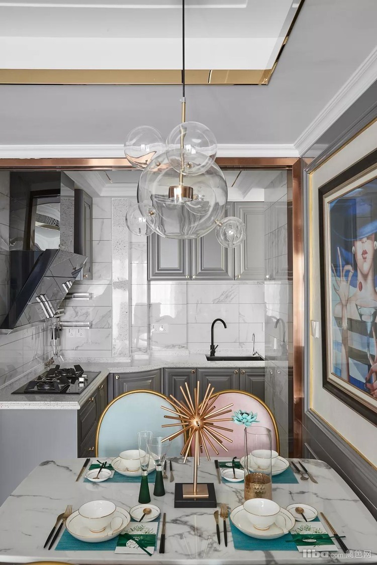 餐厅和厨房空间,餐厨之间没有做门,大理石台面和灰色的柜子、墙面都是和客厅相互呼应的设计,整体感非常强。