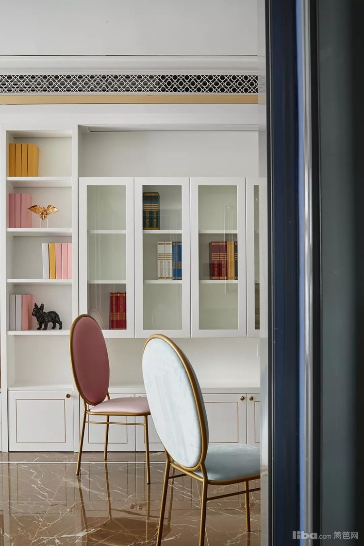 书房兼衣帽间,白色的柜子和棕色的大理石地面结合,显得宽敞明亮而又大气。