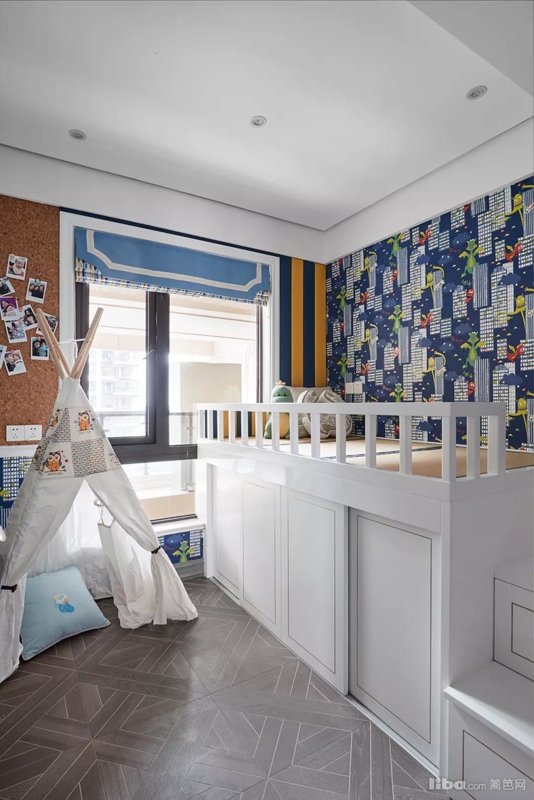 儿童房、娱乐区,打造了一个抬高的床铺,底下就是满满的收纳空间,创意铺贴的地板和帐篷结合,更具趣味性。