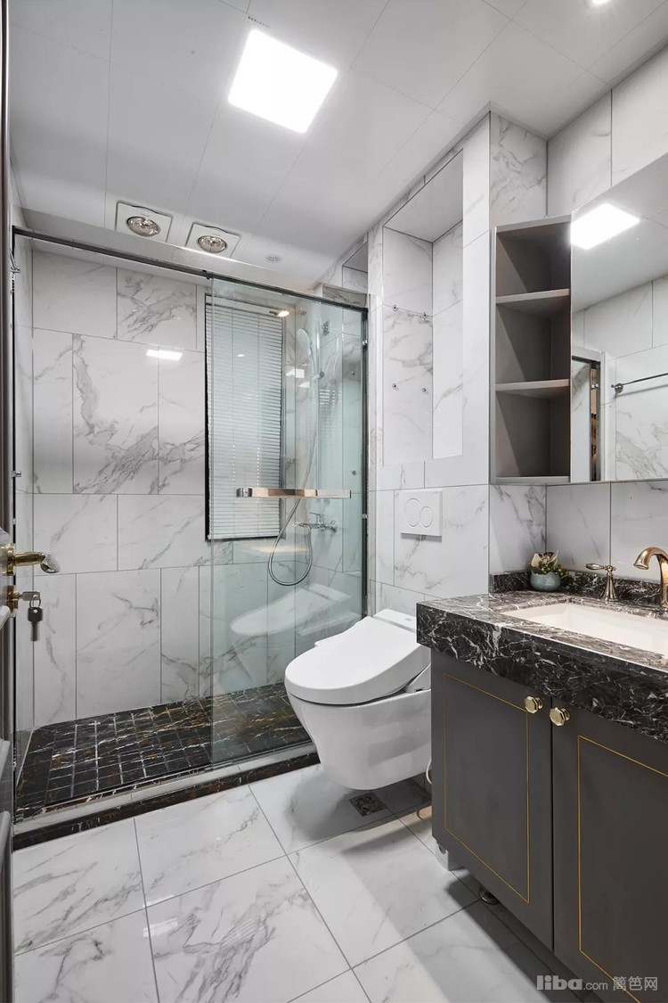 卫生间墙地面通铺白色的大理石瓷砖,让人感觉非常奢华。镜柜侧方是一个斜角收纳柜,提供更一目了然的视线,也减少物品取放会产生磕碰的可能。