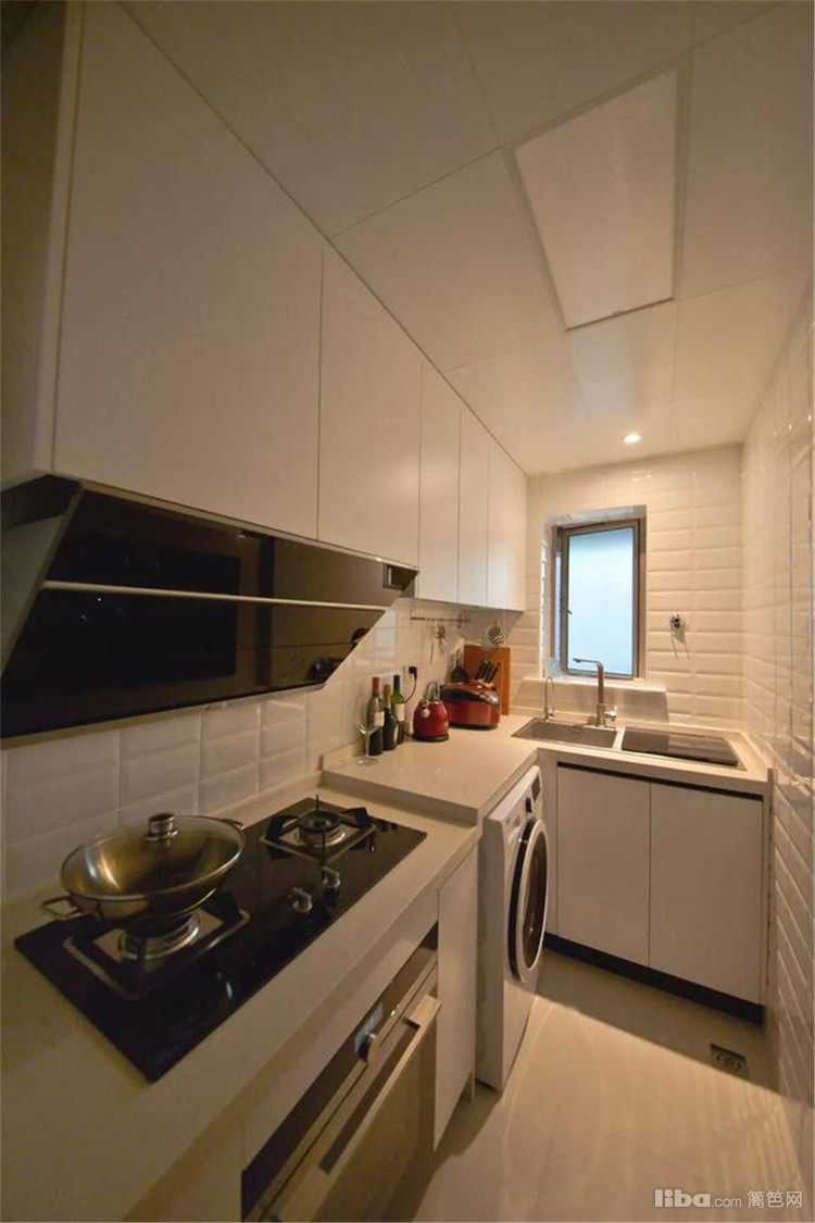 厨房空间有限,采用L型的橱柜布局,墙面全铺面包小白砖,电器做嵌入式设计,看上去干净整洁