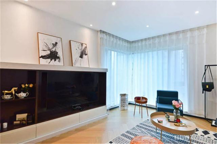 客厅布置得简洁舒适,整体以白色为主,搭配灰色双人沙发,以及低矮型的家具,营造出温馨舒适的居家环境。