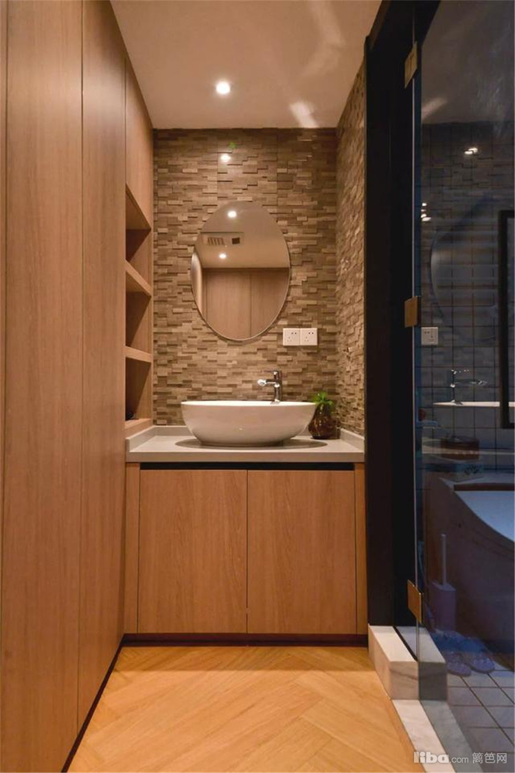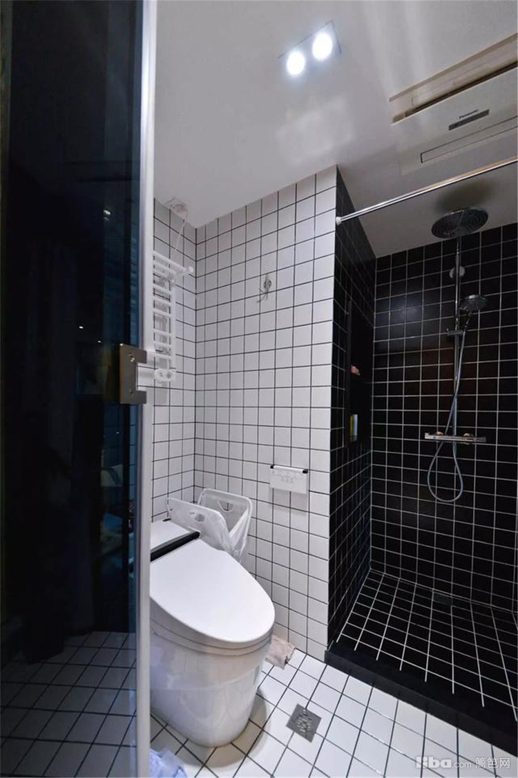 卫生间,通过洗手台外移+浴帘、挡水条,做彻底的三分离设计。原木色盥洗区+白色马桶区+黑色淋浴区,丰富了空间的层次感。