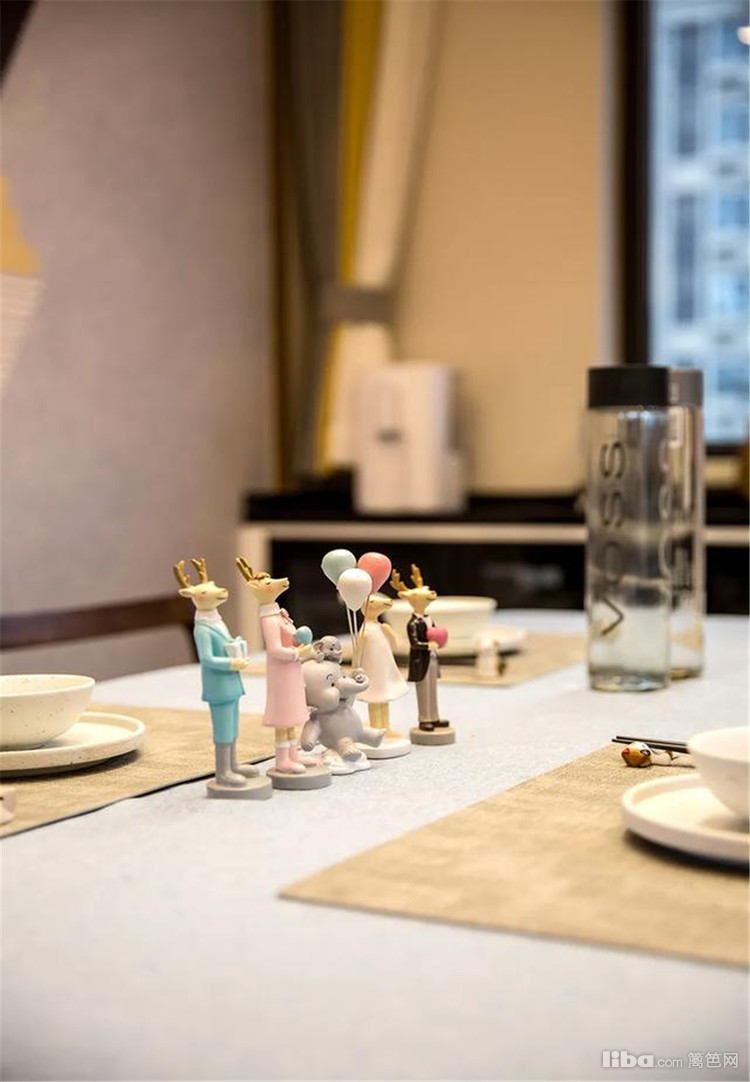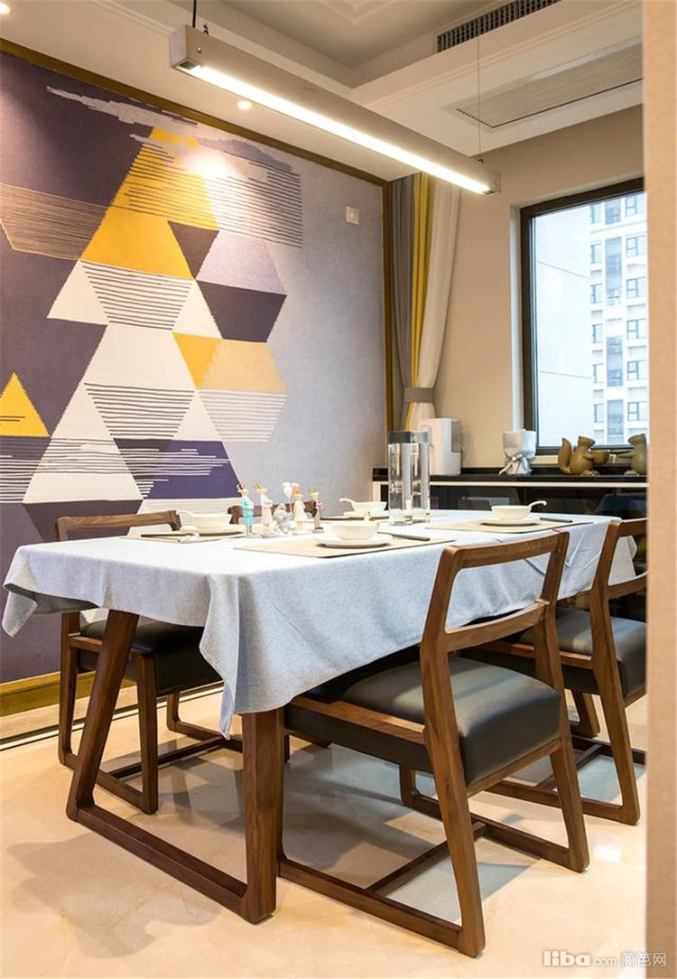 餐厅硬装方面简约大方为主,餐厅背景墙上贴着一面彩色几何图案的墙布,布置上实木的餐桌椅,餐椅是带有皮艺坐垫的设计,餐桌上垫上米灰色的桌布,整个用餐显得精致而情趣。