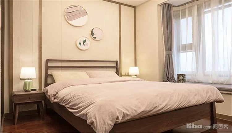 卧室床头墙以硬包的背景墙,加入边框造型,中间还挂了几幅圆形的装饰画,布置实木床与床头柜,整个卧室空间显得充满温情优雅的儒雅感。