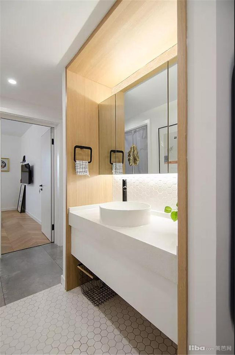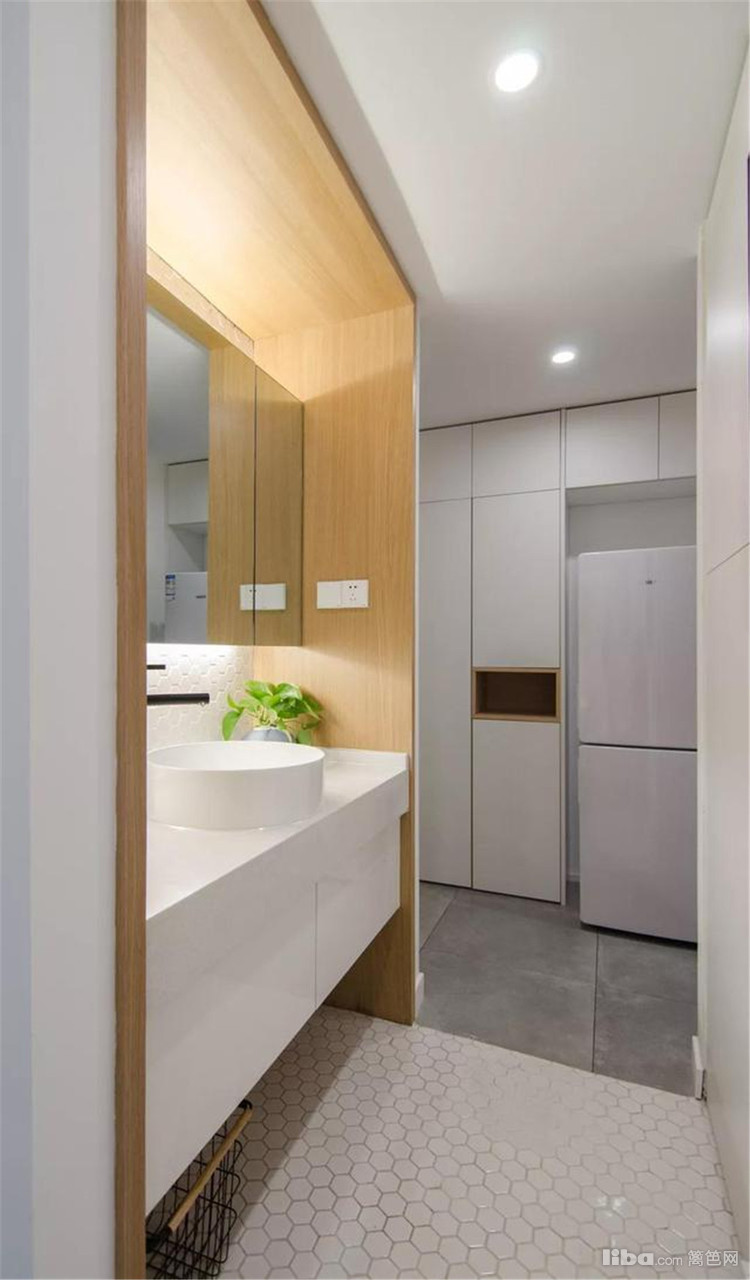 原始户型是厕所门正对卧室,老一辈的人说风水不好。因此设计师把厕所一面墙拆除,改成一个中岛台。既做到干湿分离,又便于一家人的洗漱需求。