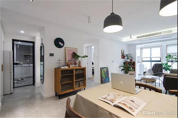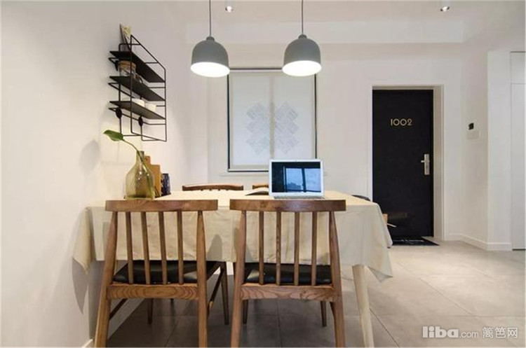 餐厅布置也十分简单,浅色餐桌布搭配黑色铁架,打造出明亮轻快的氛围。两盏圆形吊灯,暖色光照在餐桌上,十分的温馨。